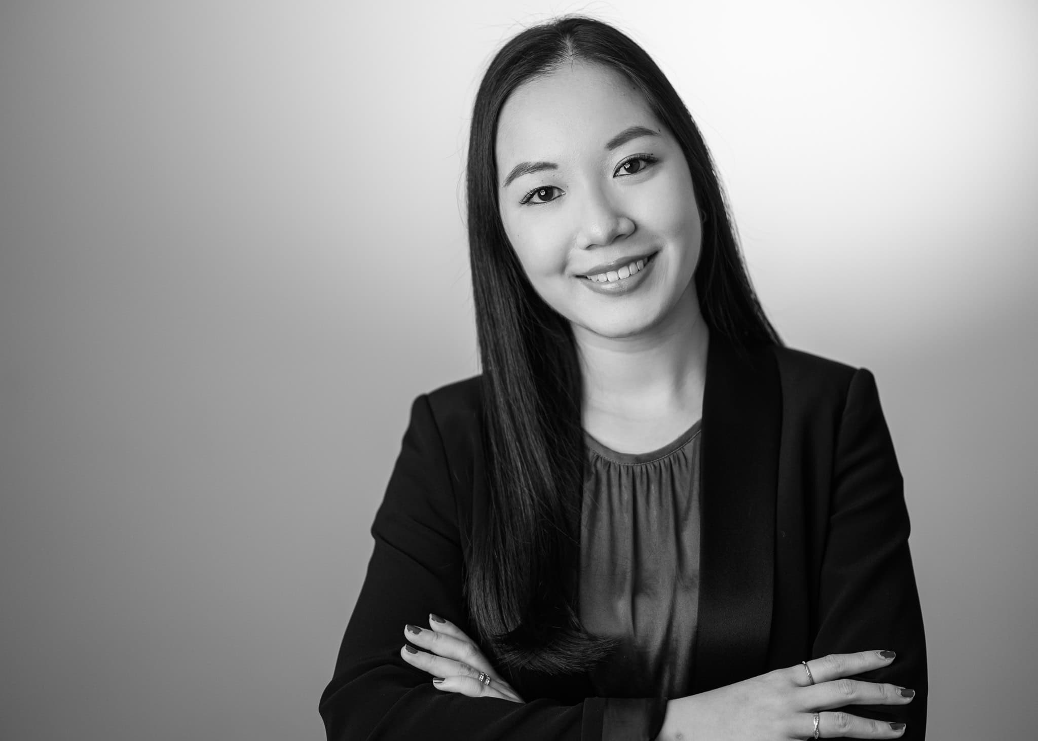 Das Bild zeigt eine junge asiatische Frau in einem schwarzen Blazer und Bluse die selbstbewusst in die Kamera lächelt Es ist ein professionelles Business Porträt ideal für Unternehmensprofile Webseiten und Marketingmaterialien