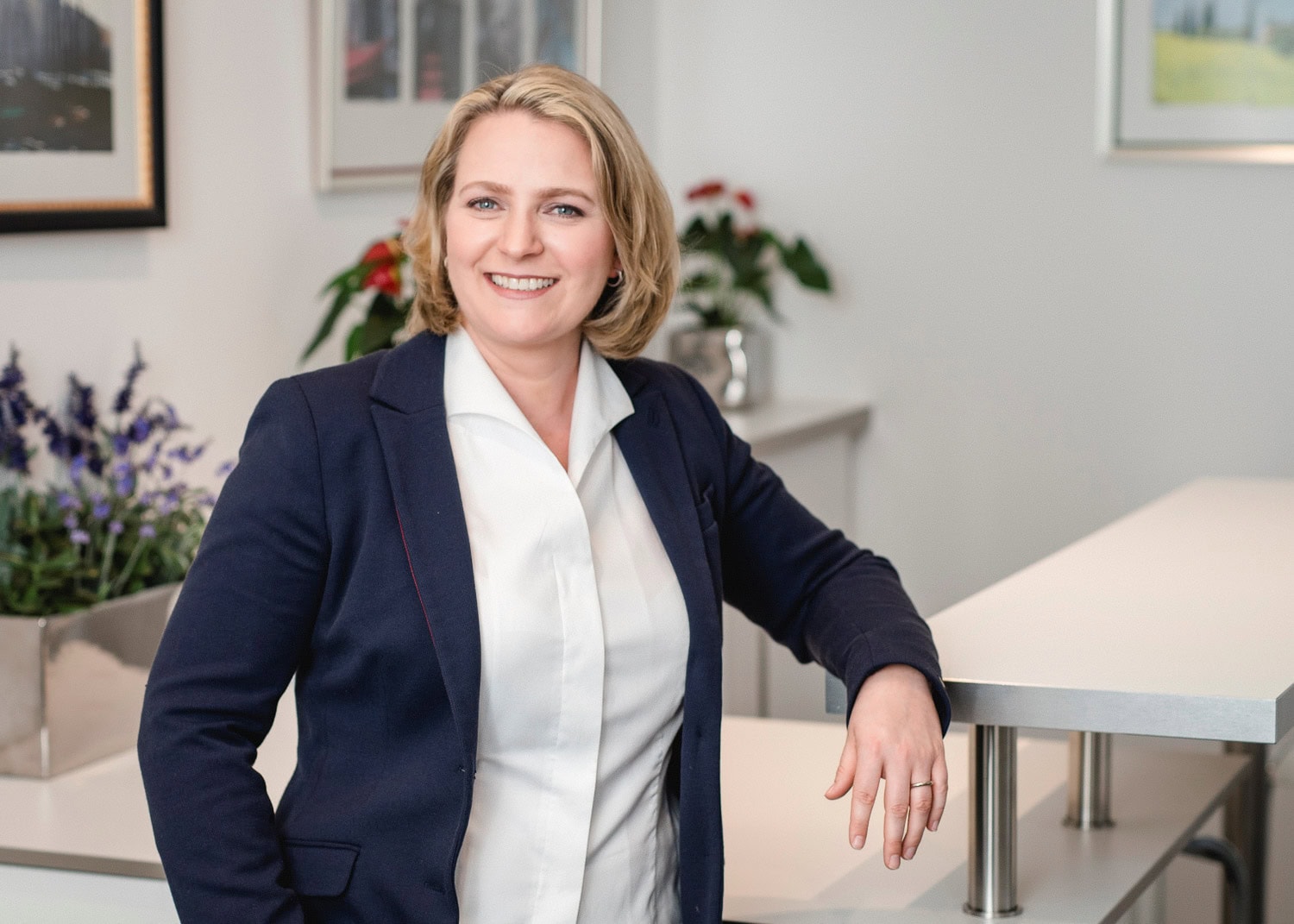 Dieses professionelle Business Porträt zeigt eine Frau in einem modernen Büro die selbstbewusst und freundlich wirkt Perfekt für Unternehmenswebseiten und Geschäftsprofile