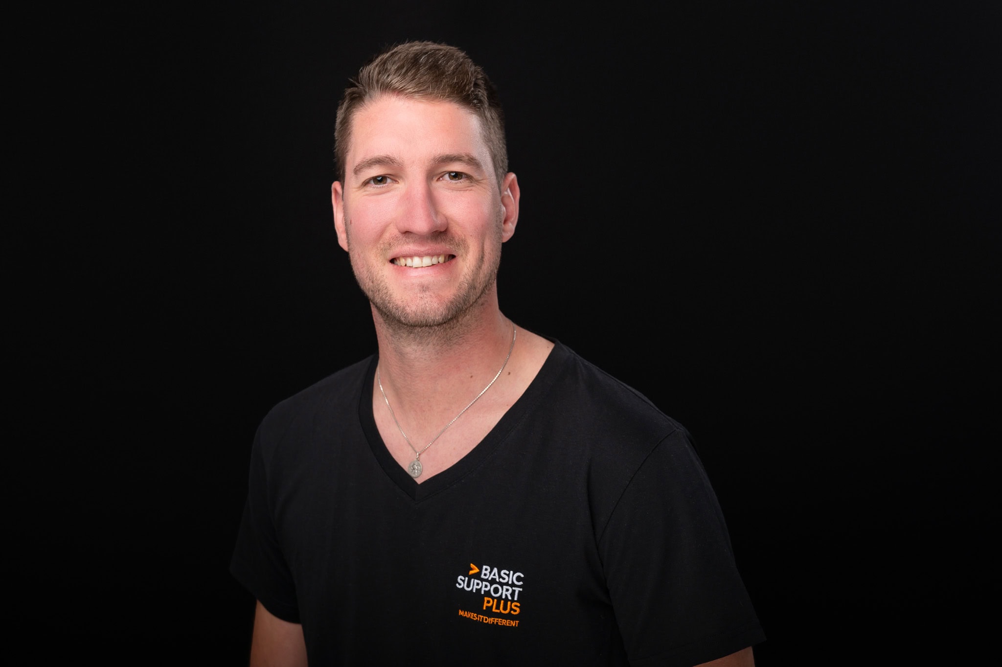 Dieses professionelle Business Porträt zeigt einen freundlichen Mann in einem schwarzen T Shirt mit Logo ideal für Firmenwebseiten und Marketingmaterialien