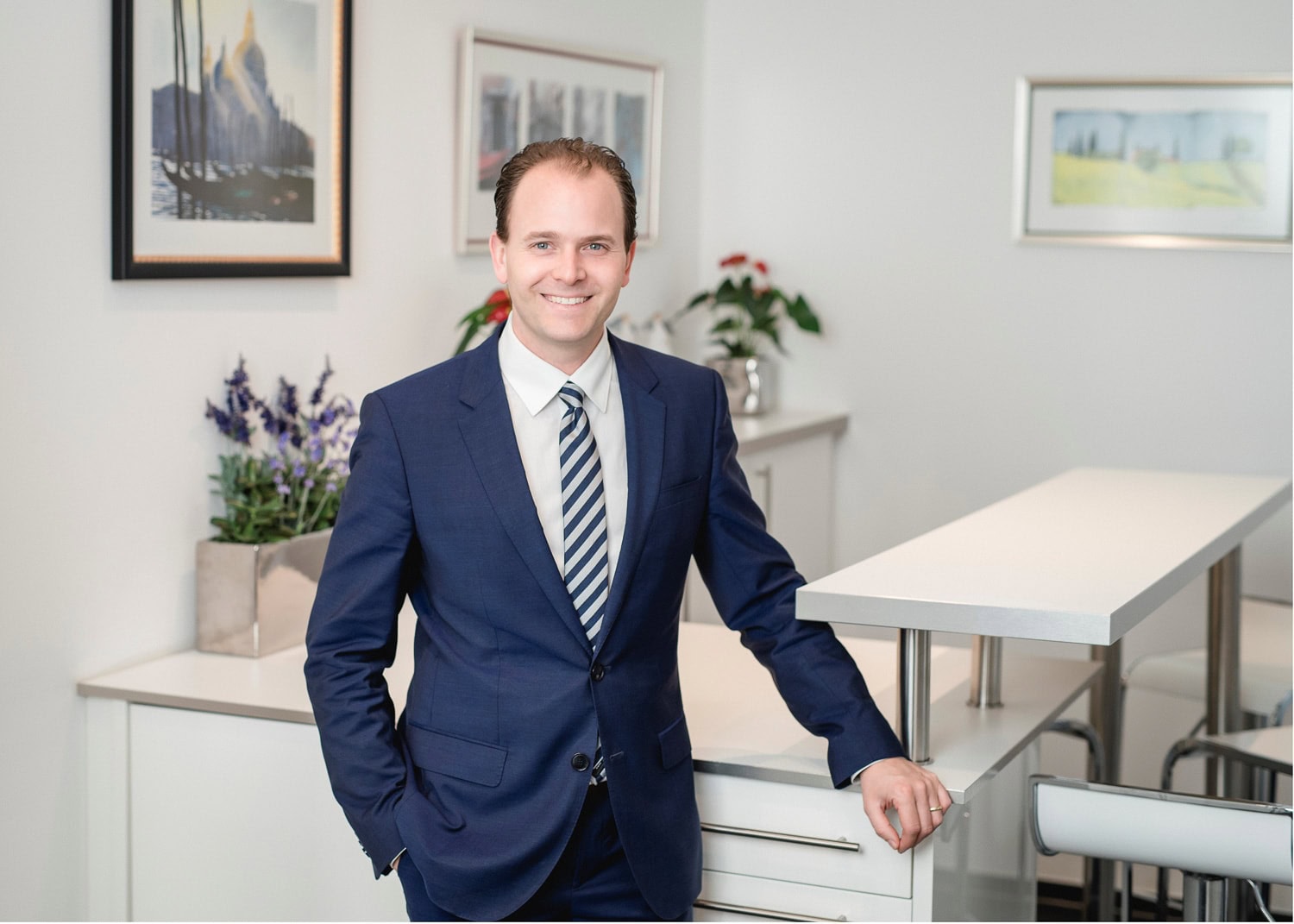 Das Bild zeigt einen professionell gekleideten Mann in einem modernen Büro der freundlich in die Kamera lächelt Perfekt für Personal Branding Unternehmens und Karrierefotos