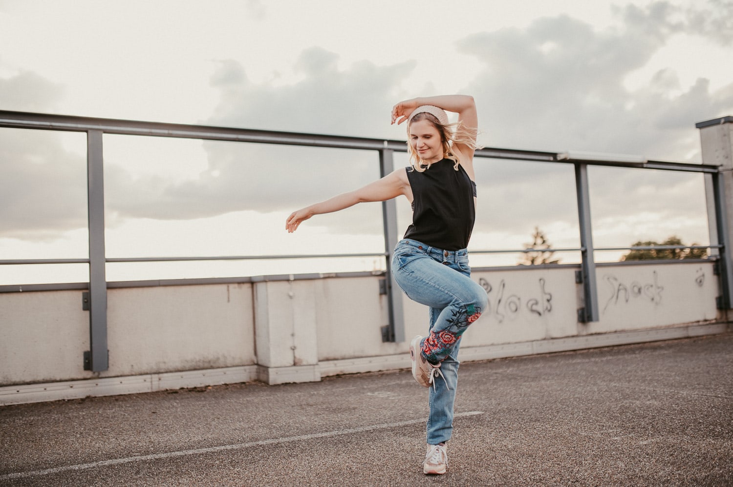 Das Bild zeigt eine glückliche Frau die auf einer Dachterrasse bei Sonnenuntergang tanzt Sie trägt Jeans und ein schwarzes Top strahlt Freude und Freiheit aus und vermittelt ein Gefühl von Lebensfreude und urbanem Lifestyle