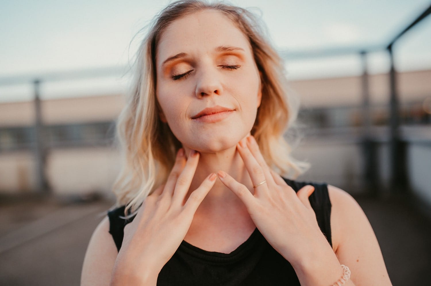 Dieses Bild zeigt eine Frau in entspannter Pose mit geschlossenen Augen die kreative und professionelle Portraitfotografie für Business und persönliche Zwecke