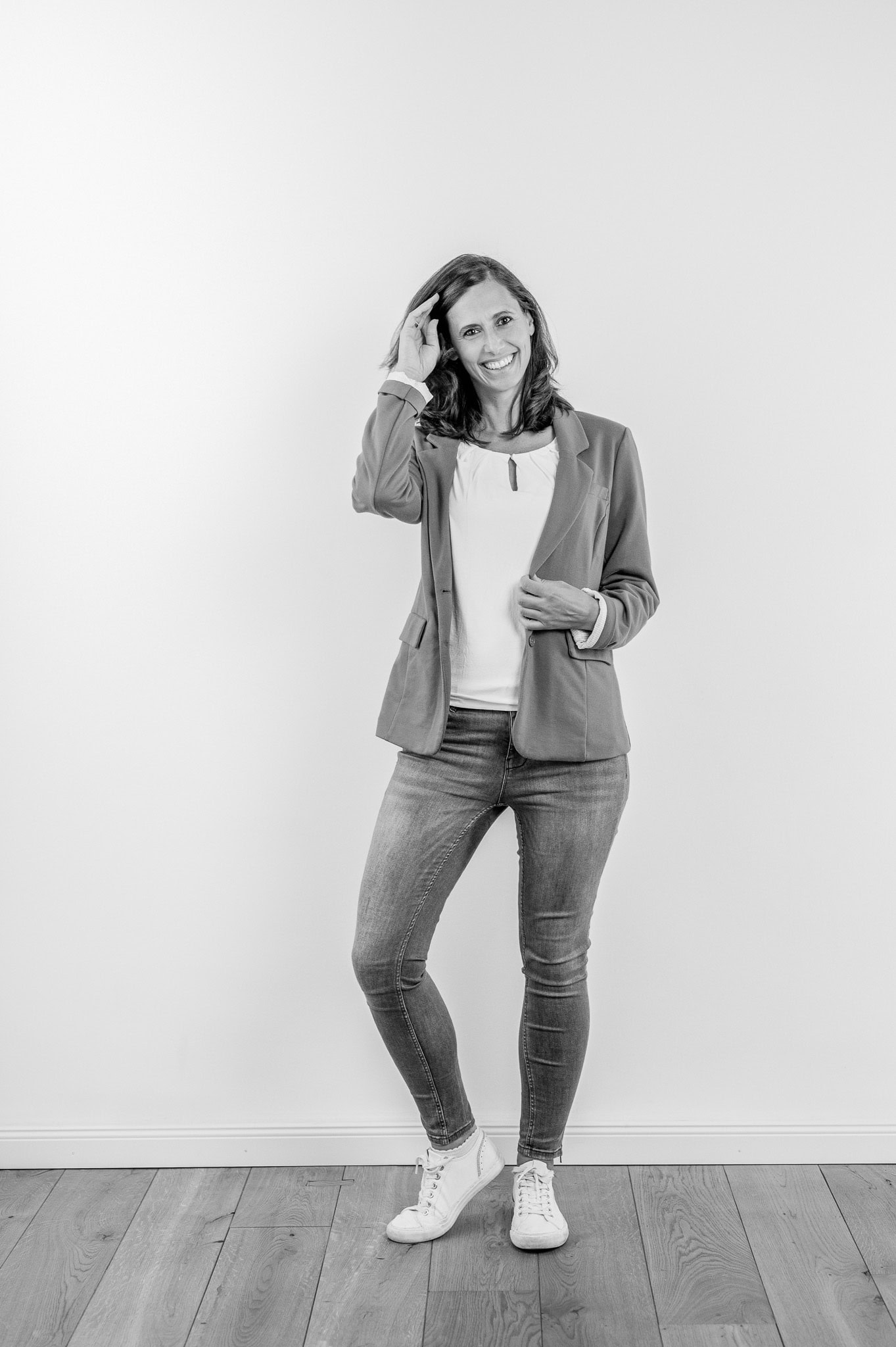 Das Bild zeigt eine junge Frau in casual Businesskleidung die vor einem weißen Hintergrund steht Perfekt für Personal Branding Karrierefotos und Unternehmensportraits