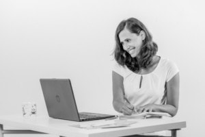Die Frau arbeitet konzentriert an einem weißen Tisch nutzt einen Laptop und macht Notizen was auf eine professionelle Bürosituation hinweist Das Bild vermittelt Produktivität und Organisation im Arbeitsumfeld