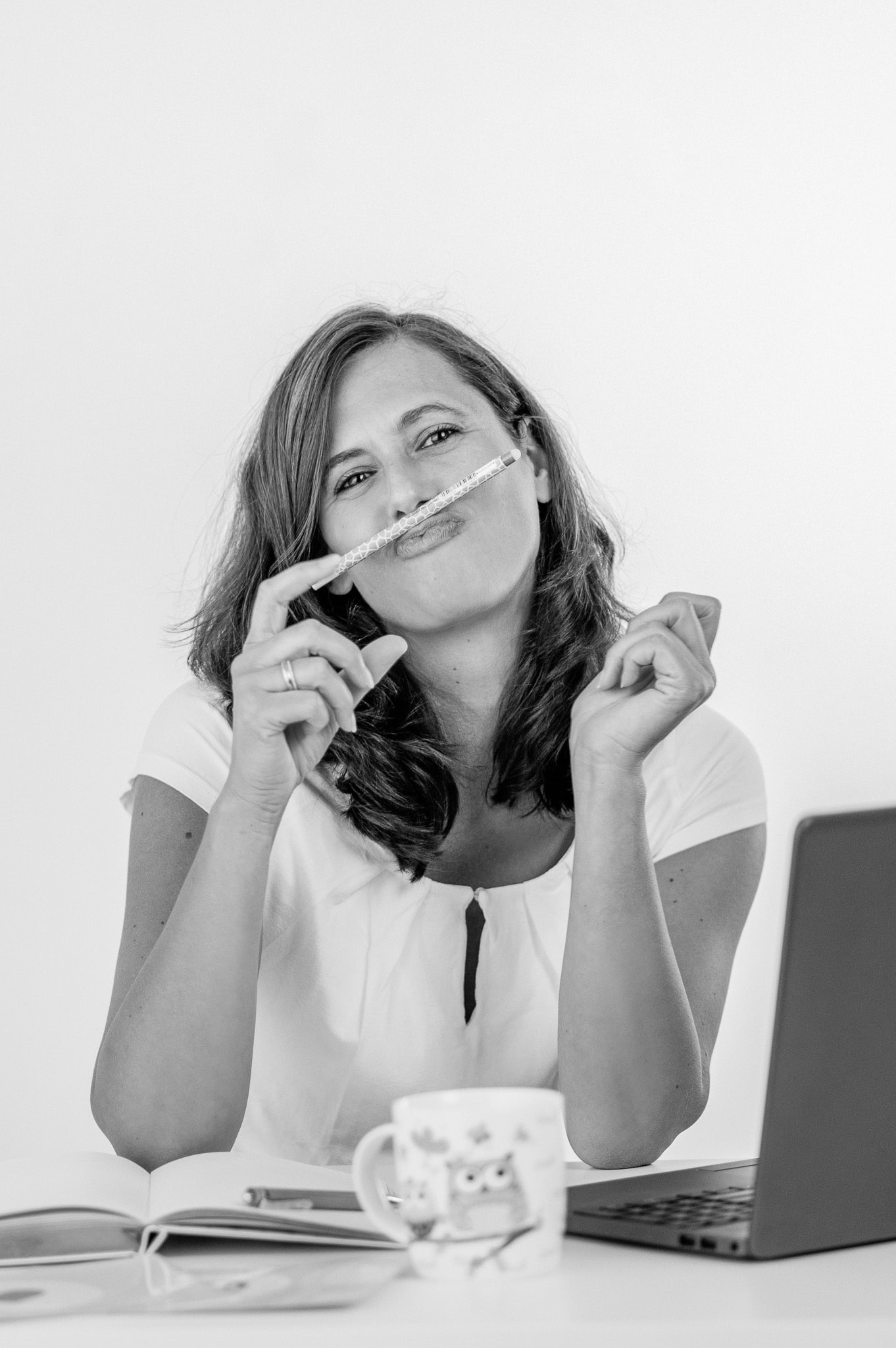 Das Bild zeigt eine junge Frau in einem professionellen Umfeld die humorvoll einen Bleistift auf die Nase legt Es vermittelt Selbstbewusstsein Kreativität und Persönlichkeit ideal für Business und Personal Branding Fotos Die Szene ist in Schwarz Weiß gehalten was den Fokus auf die Ausstrahlung und den Ausdruck der Person legt Perfekt für Unternehmensfotografie die Authentizität und Professionalität betont