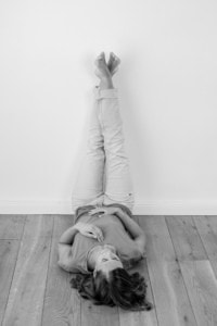 Das Bild zeigt eine junge Frau in einem professionellen Outfit die entspannt auf dem Boden liegt Ihre Beine sind gegen die weiße Wand gestreckt während sie auf dem Rücken liegt Die Szene vermittelt eine kreative und lockere Atmosphäre ideal für Personal Branding und Karrierefotos im Businessbereich Die minimalistische Umgebung hebt die Person und ihre entspannte Haltung hervor passend für moderne Unternehmensfotografie