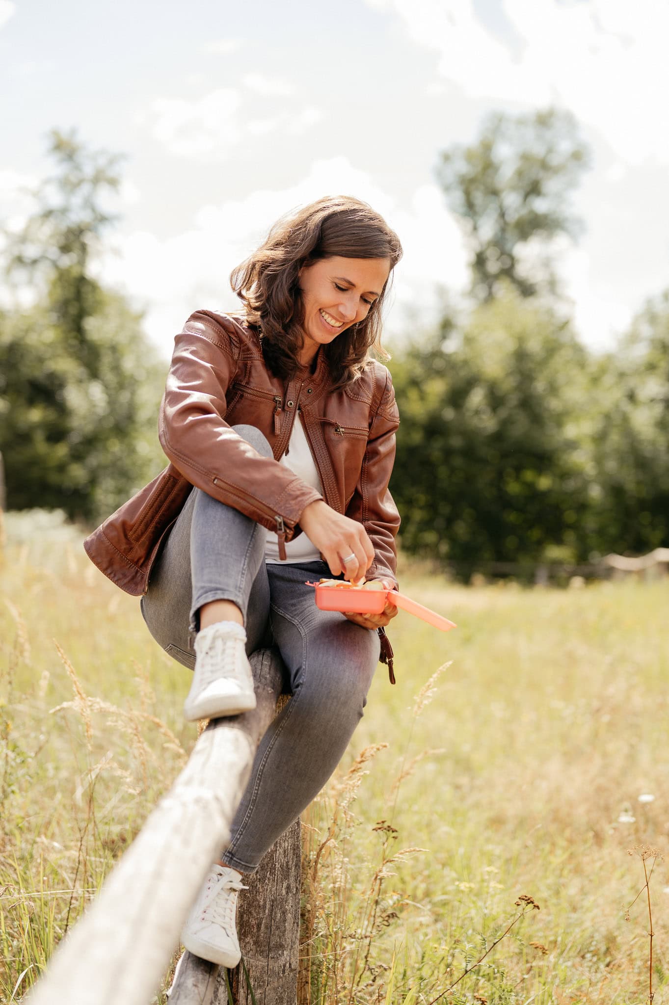 Die Frau sitzt entspannt auf einem Baumstamm in der Natur umgeben von Bäumen und Wiesen bei sonnigem Wetter Perfekt für Natur und Outdoor Fotografie