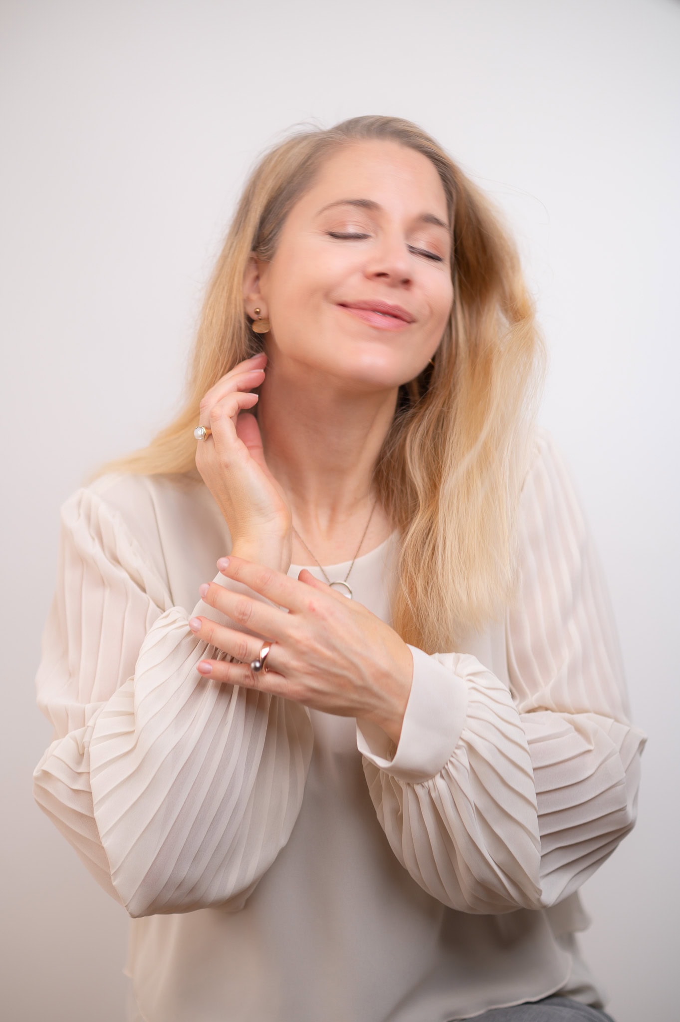 Das Bild zeigt eine junge Frau in eleganter Businesskleidung die mit einem entspannten Lächeln und geschlossenen Augen wirkt Es vermittelt Selbstvertrauen Professionalität und Authentizität ideal für Unternehmens und Personal Branding Fotos Die helle neutrale Hintergrundgestaltung lenkt den Fokus auf die Person und unterstreicht die professionelle Atmosphäre Perfekt für Karriere und Businessfotografie