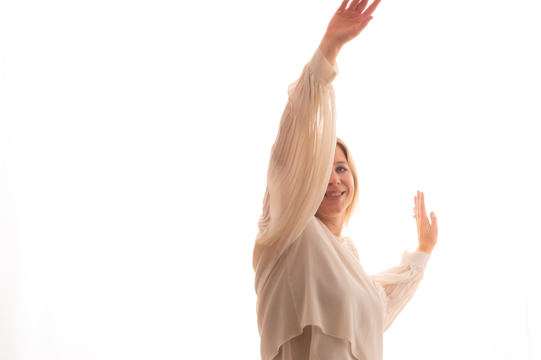 Das Bild zeigt eine selbstbewusste Frau in einem hellen Outfit die mit offenen Armen in die Kamera lächelt Es eignet sich für Businessfotografie Personal Branding und Karrierefotos um Kompetenz und Positivität zu vermitteln Perfekt für Unternehmenspräsentationen LinkedIn Profile oder Marketingmaterialien