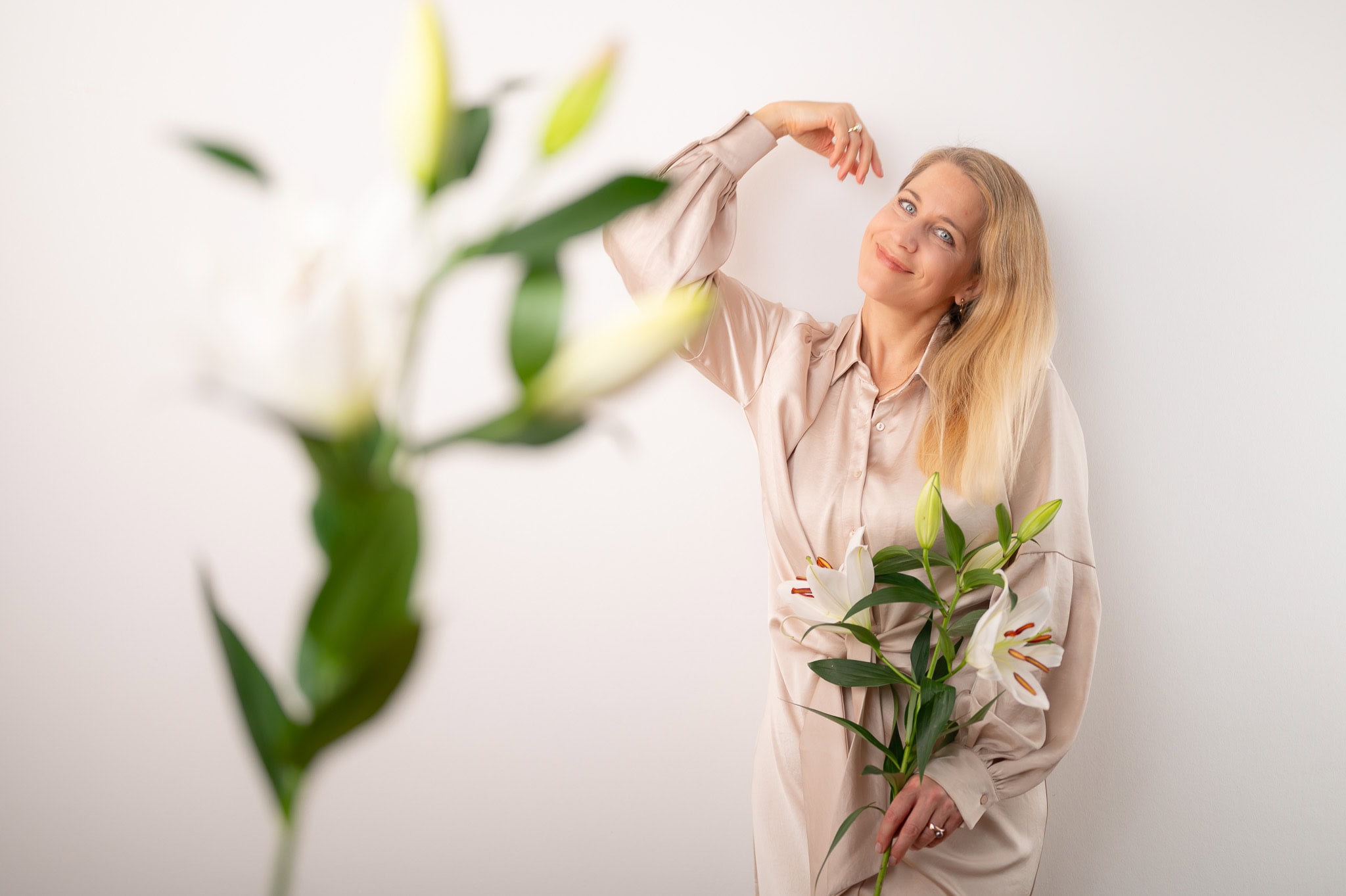 Hochwertiges Businessportrait einer Frau die mit Blumen posiert geeignet für Personal Branding Karrierefotos und Unternehmenspräsentationen Die Aufnahme betont Professionalität und Authentizität