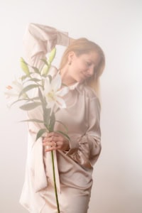 Dieses Bild zeigt eine Frau die eine Lilie hält in einem eleganten Satin Outfit geeignet für professionelle Business und Werbefotografie