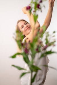 Ein fröhliches Portrait einer lachenden Frau die einen Blumenstrauß hält in einem professionellen Business Umfeld Perfekt für kreative Fotografie und Business Images