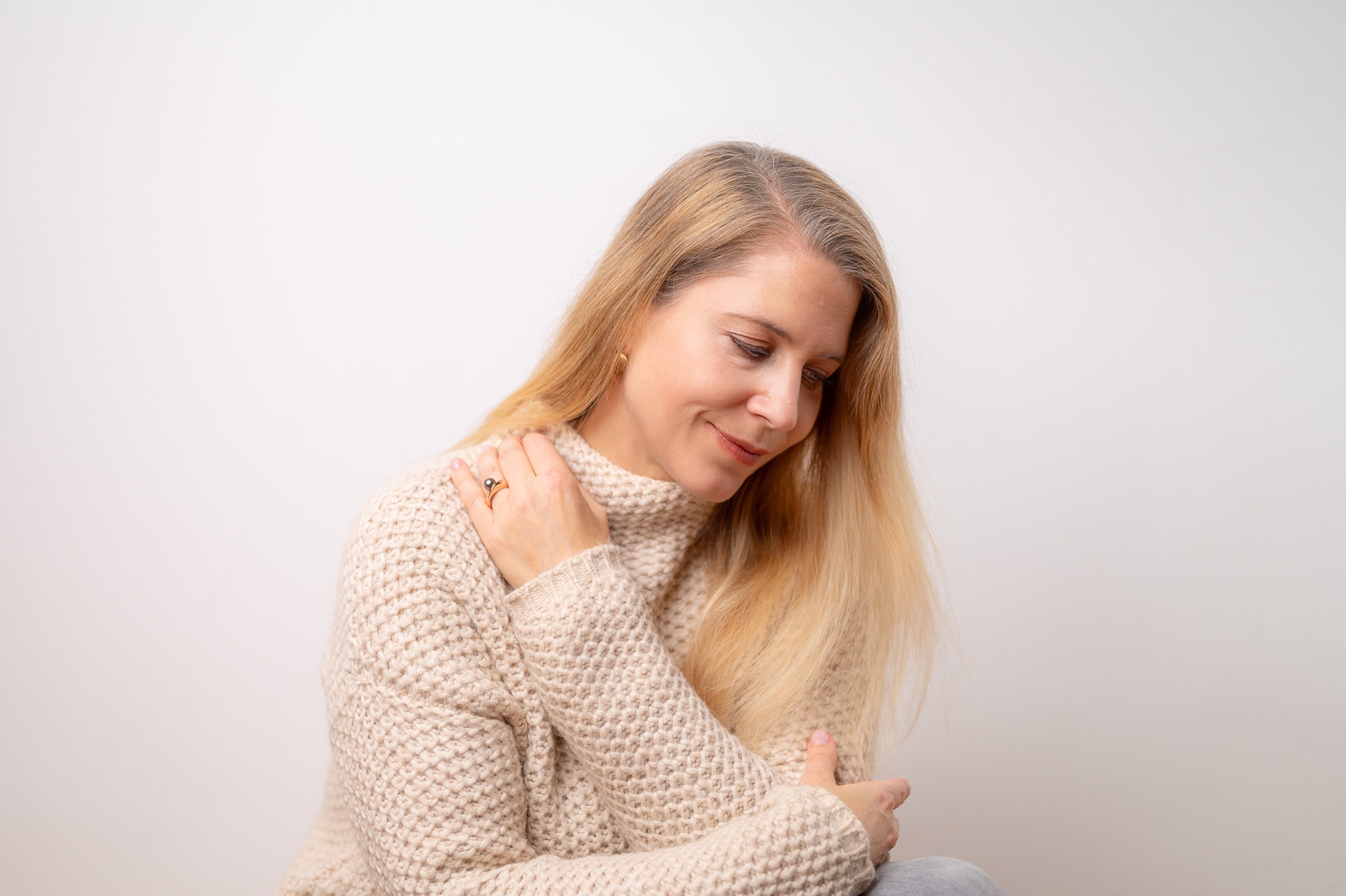 Das Bild zeigt eine junge Frau in einem gemütlichen Pullover die in einem professionellen Fotoshooting entspannt und freundlich wirkt Perfekt für Themen wie Lifestyle Mode oder persönliche Entwicklung