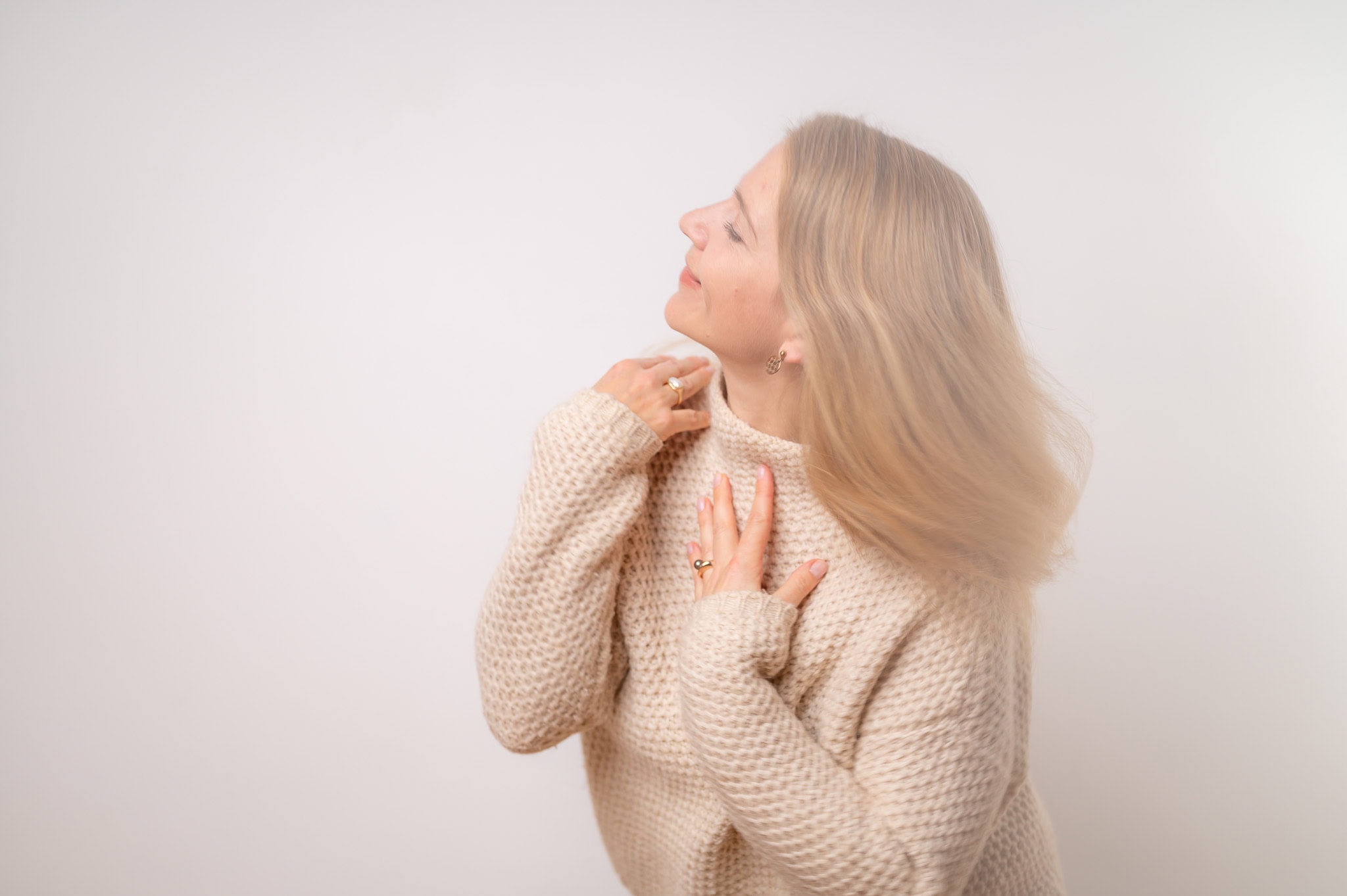 Das Bild zeigt eine Frau in einem hellen kuscheligen Pullover die in einer natürlichen Pose nach oben blickt Es vermittelt Selbstvertrauen Authentizität und Professionalität perfekt für Businessfotografie Personal Branding und Karrierefotos Die helle schlichte Kulisse hebt die Person in den Fokus ideal für Unternehmensprofile