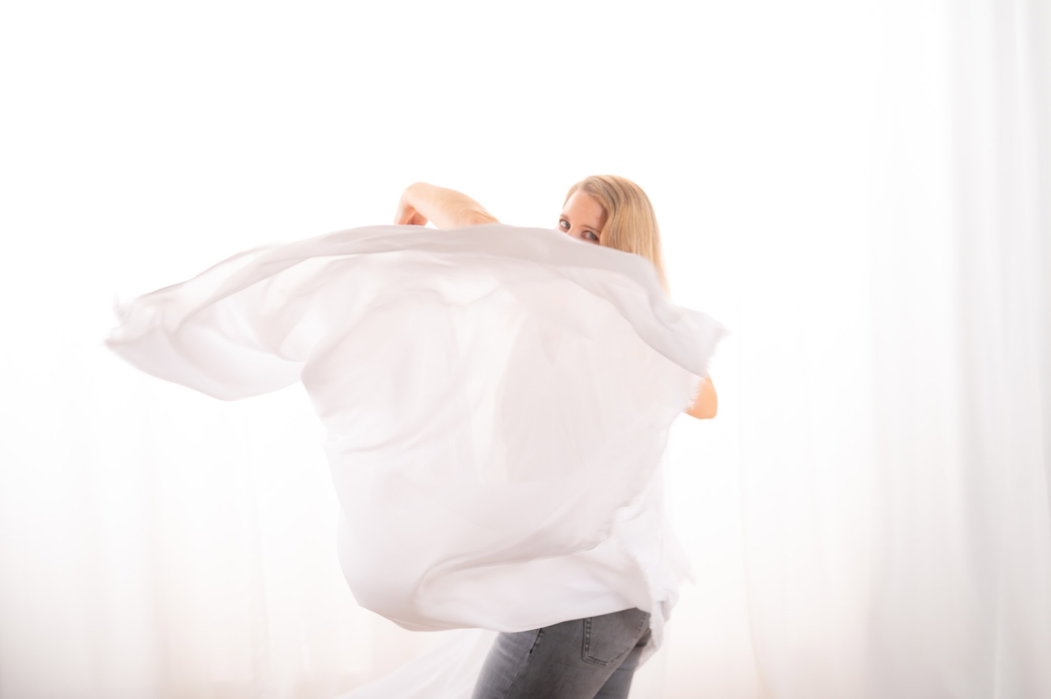 Das Bild zeigt eine Frau die dynamisch mit einem weißen Tuch posiert ideal für Unternehmens und Businessfotografie Es vermittelt Selbstbewusstsein und Professionalität perfekt für Karriere und Personal Branding Die helle freundliche Atmosphäre unterstreicht die Authentizität und den modernen Anspruch der Businessfotografie