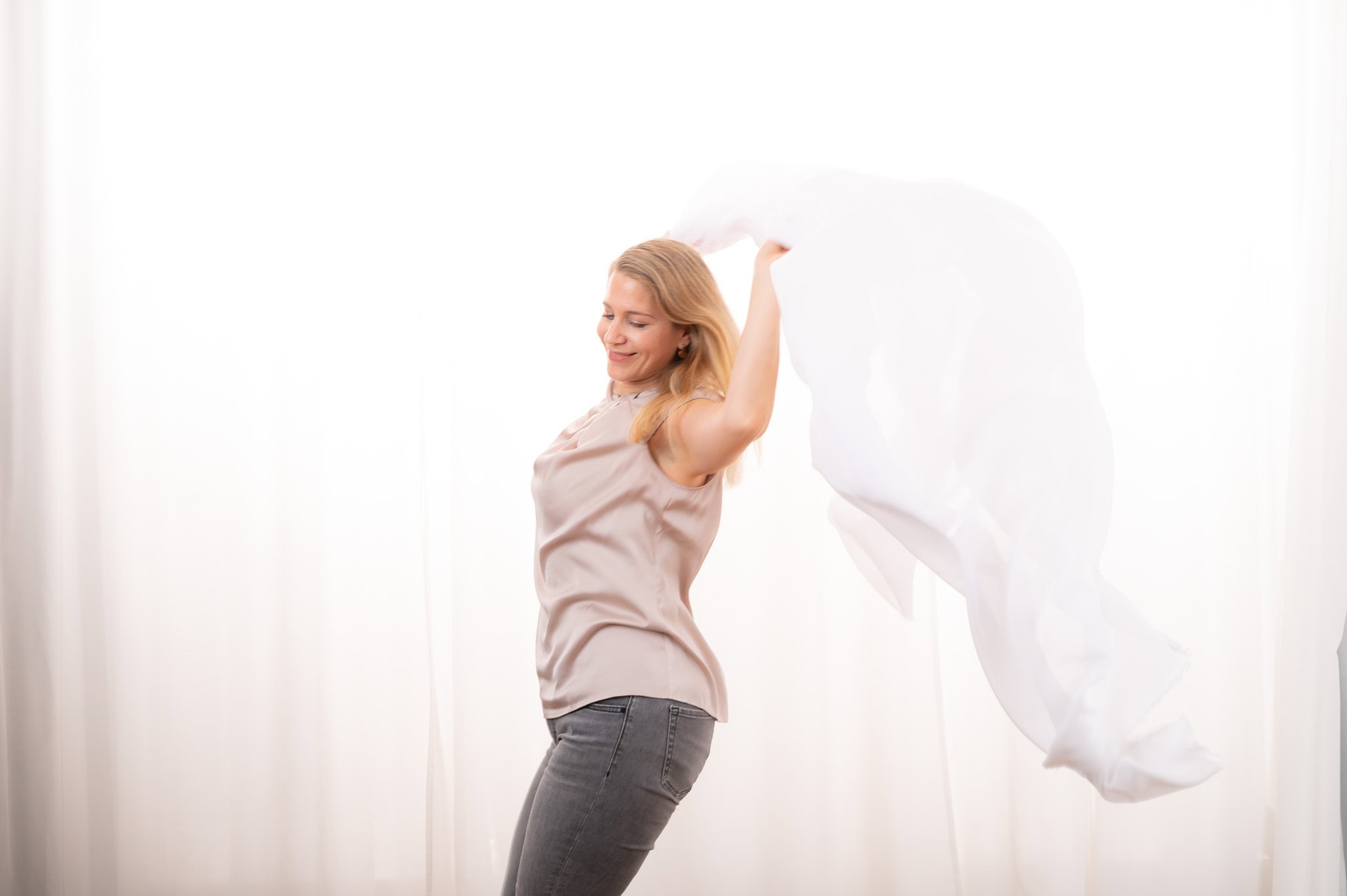 Das Bild zeigt eine junge Frau die fröhlich mit einem weißen Tuch im Wind spielt Es vermittelt Kreativität Positivität und Dynamik perfekt für Business und Marketingzwecke