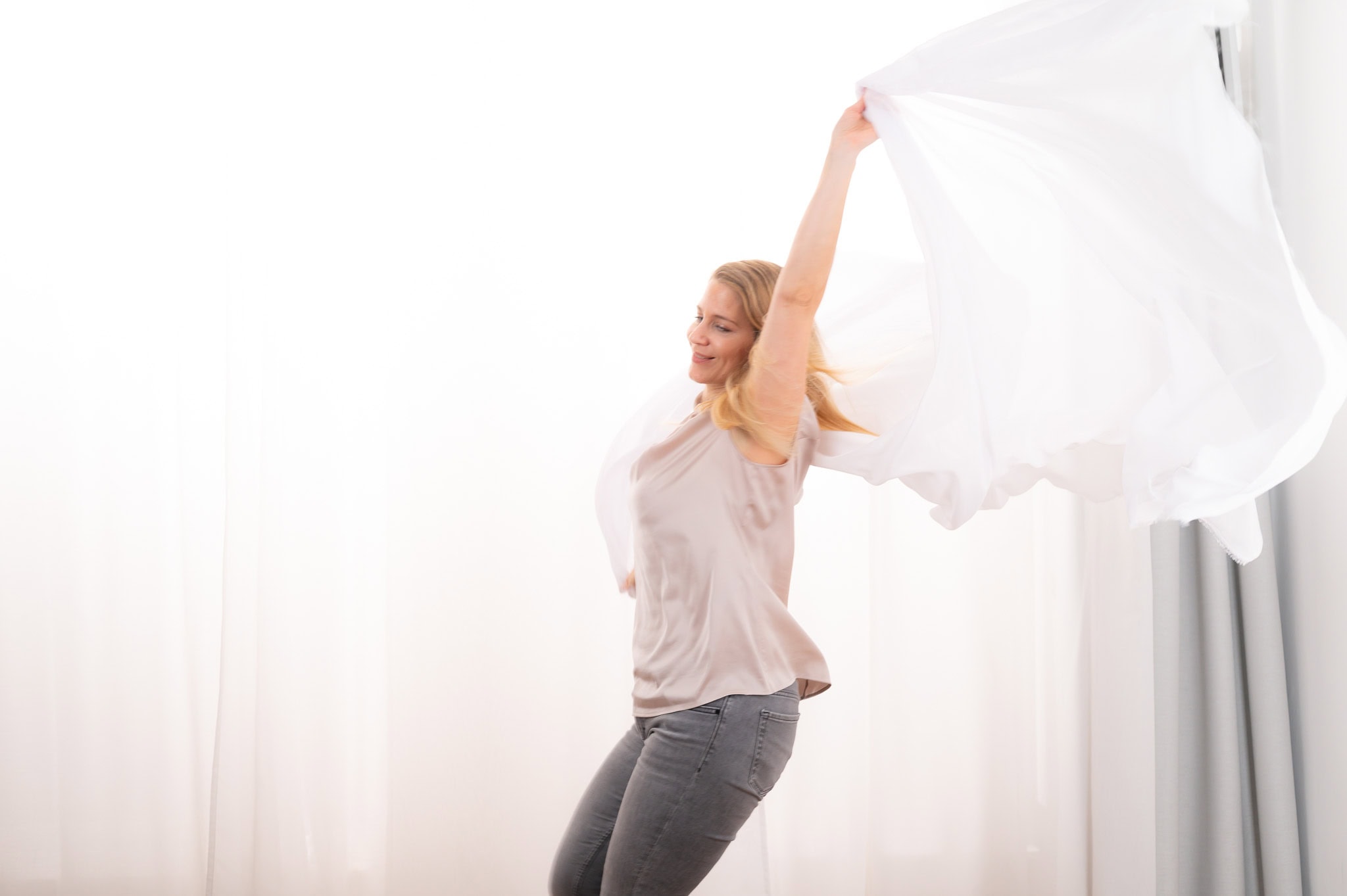 Professionelles Business Foto einer Frau die mit einem weißen Tuch kreativ posiert Perfekt für Marketing Werbung und Unternehmenspräsentationen