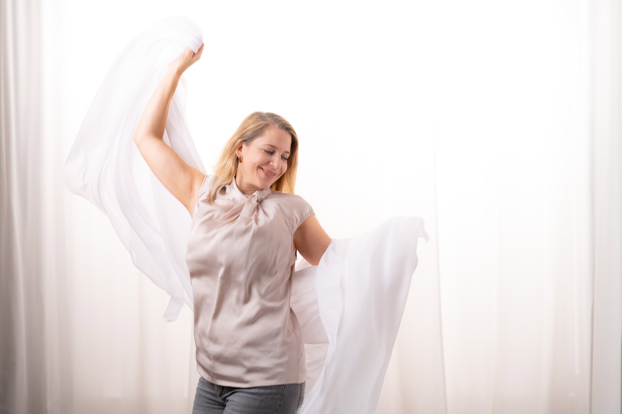 Professionelles Businessfoto einer Frau die mit weißen Stoffen für Personal Branding und Karriereaufnahmen posiert geeignet für Unternehmensfotografie
