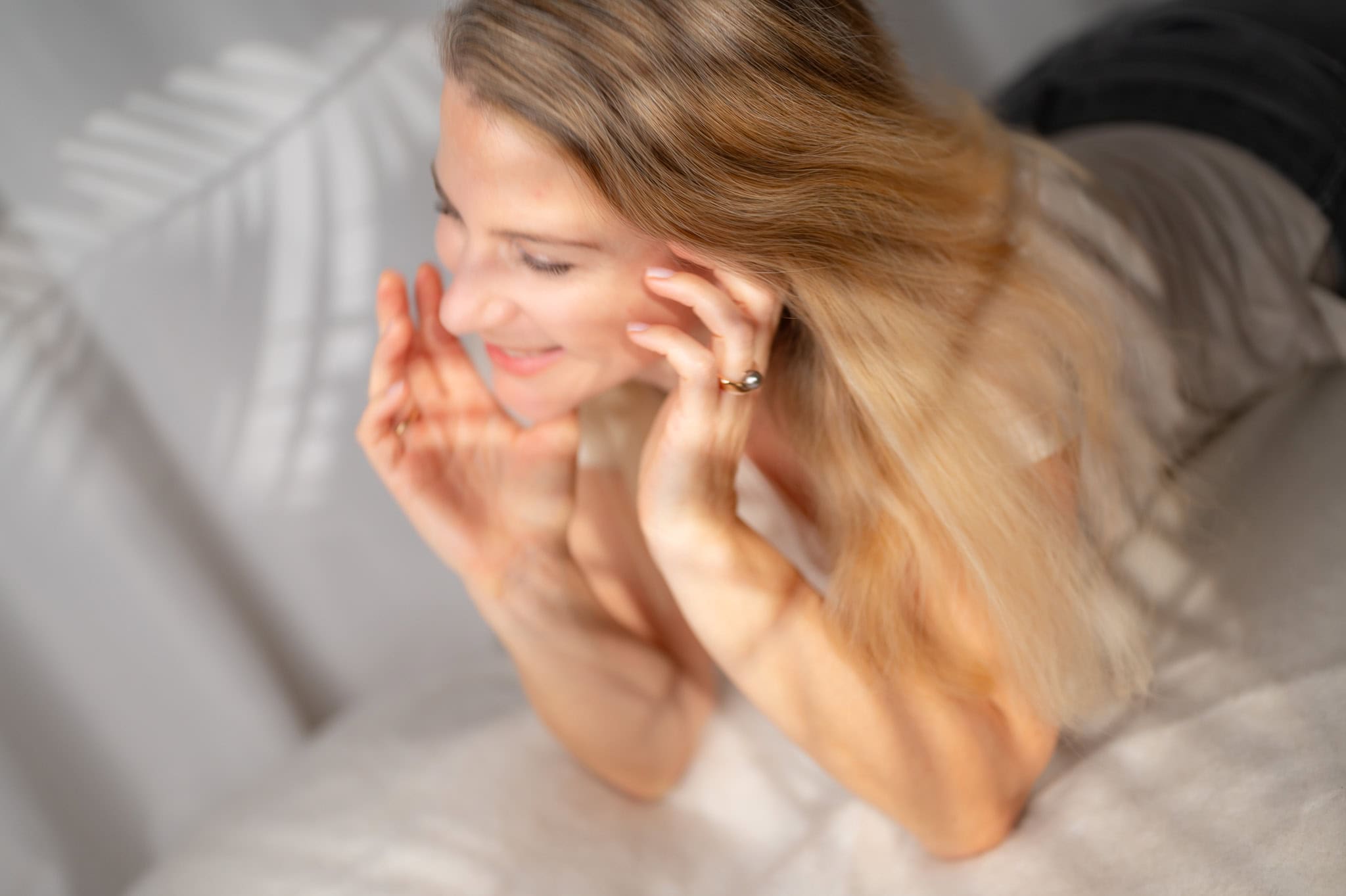 Das Bild zeigt eine junge Frau die bei einem Fotoshooting für Business und Karrierefotos entspannt und glücklich wirkt Es vermittelt Professionalität Selbstvertrauen und Authentizität passend für Unternehmensfotografie und Personal Branding