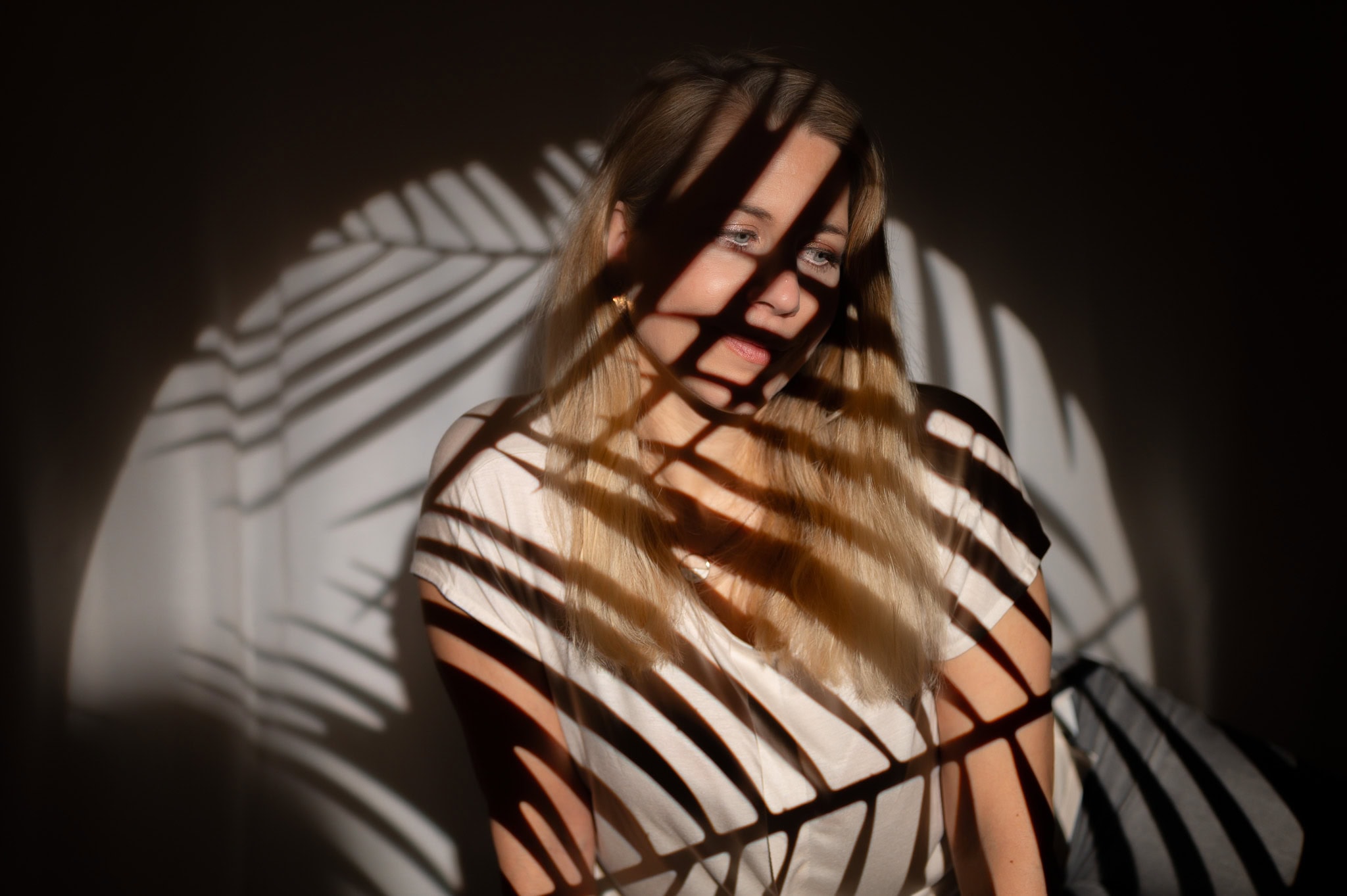 Dieses kreative Businessfoto zeigt eine Frau die durch Licht und Schattenmuster auf ihrem Gesicht und ihrer Kleidung eine moderne und künstlerische Atmosphäre schafft Ideal für Karriere und Unternehmensfotografie um Persönlichkeit und Professionalität zu vermitteln