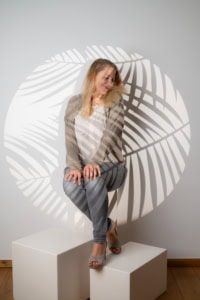 Frau in Businessoutfit auf weißen Quadern kreative Schatten einer Palme im Hintergrund perfekt für Business und Personal Branding Fotos