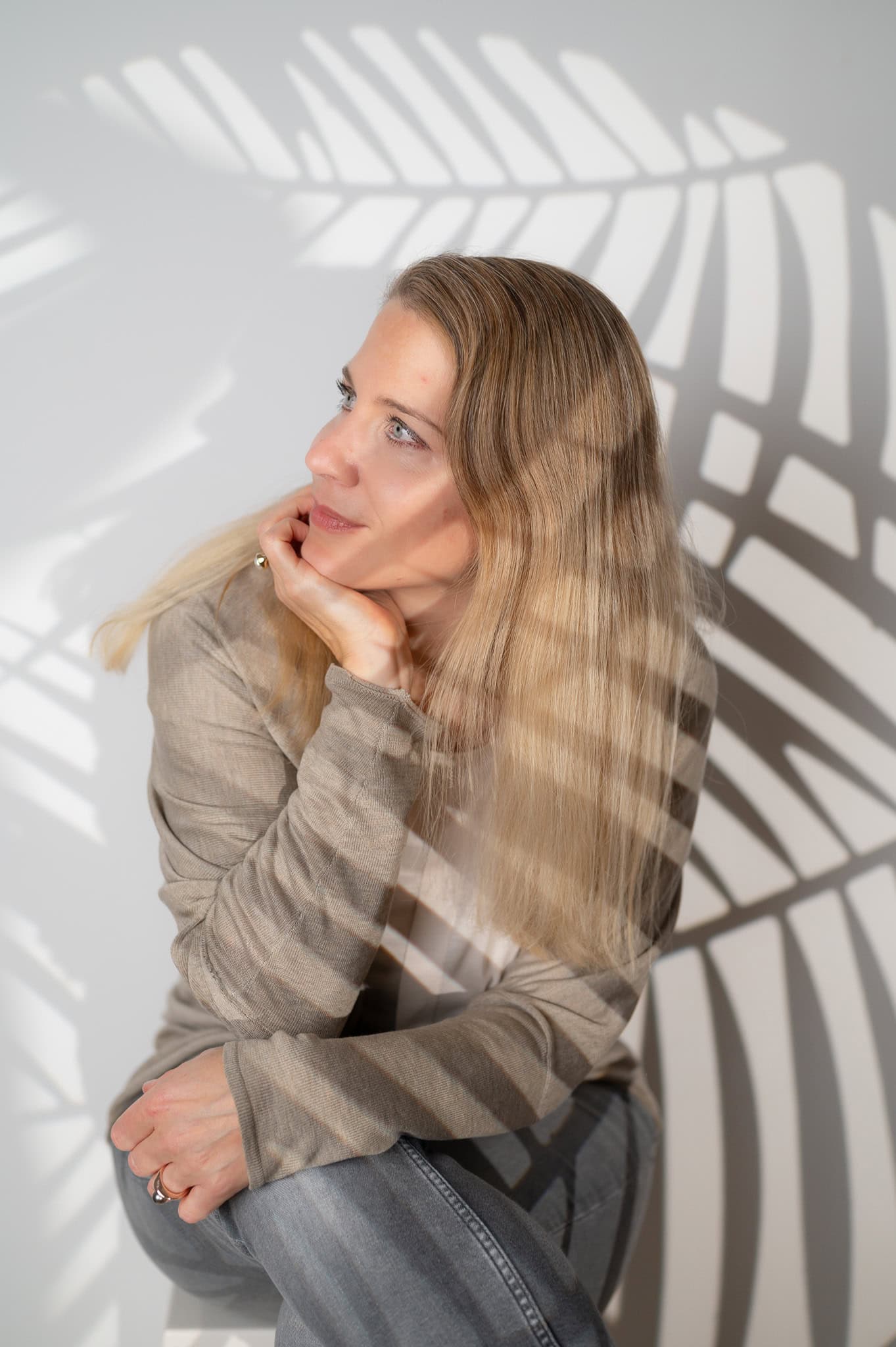 Das Bild zeigt eine Frau in Businesskleidung die entspannt und selbstbewusst wirkt Sie sitzt vor einem weißen Hintergrund auf dem Schatten einer Palme fällt was dem Foto eine kreative und moderne Note verleiht Perfekt geeignet für Unternehmens und Karrierefotos die Persönlichkeit und Professionalität ausstrahlen Ideal für Personal Branding Businessfotografie und Unternehmensportraits