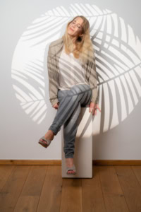 Professionelles Businessfoto einer Frau die vor einer weißen Wand mit Schattenmuster steht geeignet für Unternehmens und Personal Branding Die Aufnahme betont Selbstbewusstsein und Stil