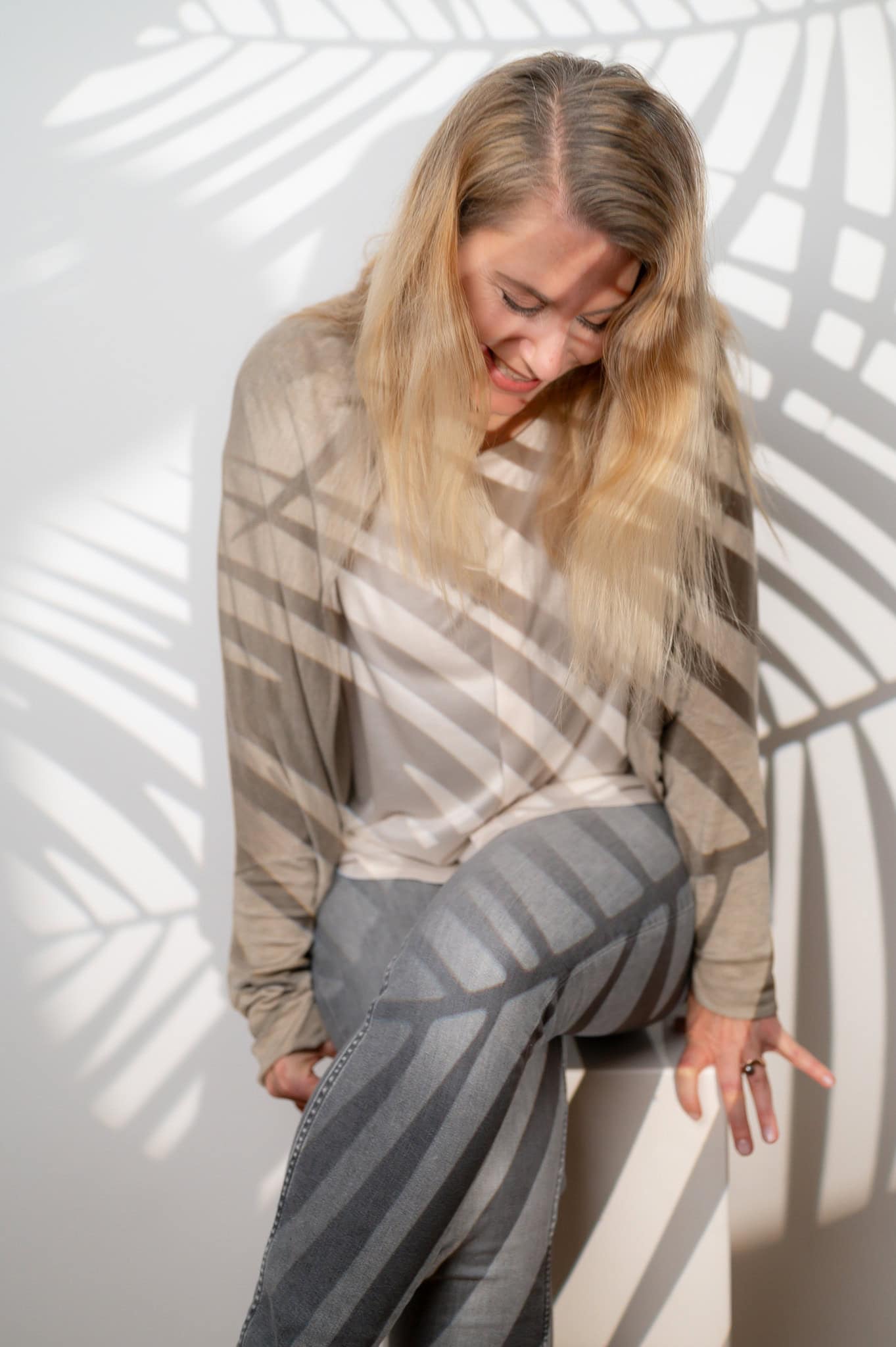 Das Bild zeigt eine junge Frau in Businesskleidung die bei einem Fotoshooting für Unternehmens und Personal Branding fotografiert wird Die kreative Beleuchtung und das moderne Setting unterstreichen ihre professionelle Ausstrahlung ideal für Karrierefotos und Businessfotografie Die Aufnahme vermittelt Kompetenz Selbstsicherheit und einen modernen erfolgreichen Eindruck
