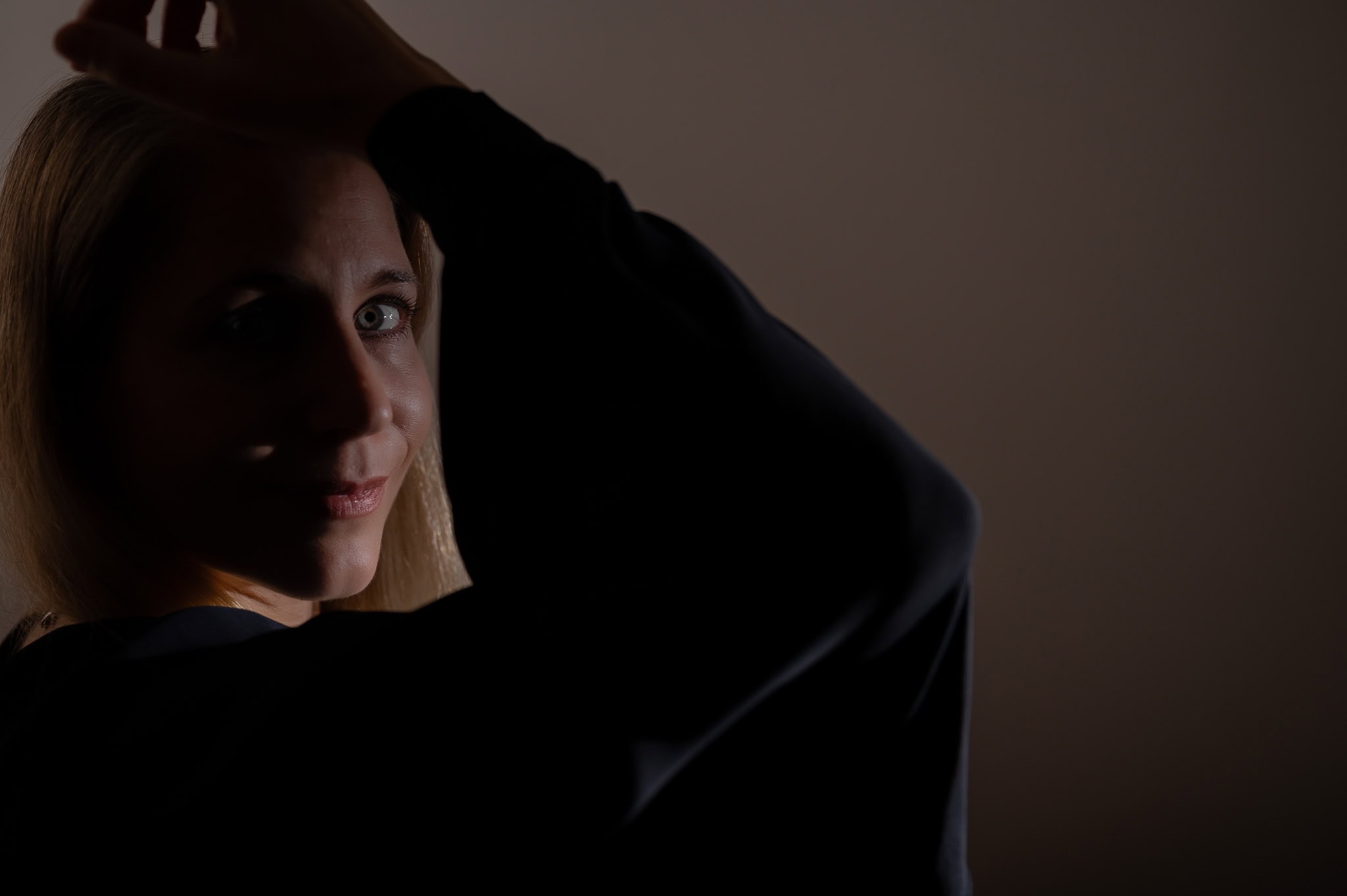 Das Bild zeigt eine Frau in einem dunklen Umfeld die für Business und Firmenportraits fotografiert wurde Es vermittelt Professionalität und Selbstvertrauen perfekt für Unternehmenswebseiten LinkedIn Profile und Marketingmaterialien Hochwertige Portraitfotografie für Ihren Erfolg