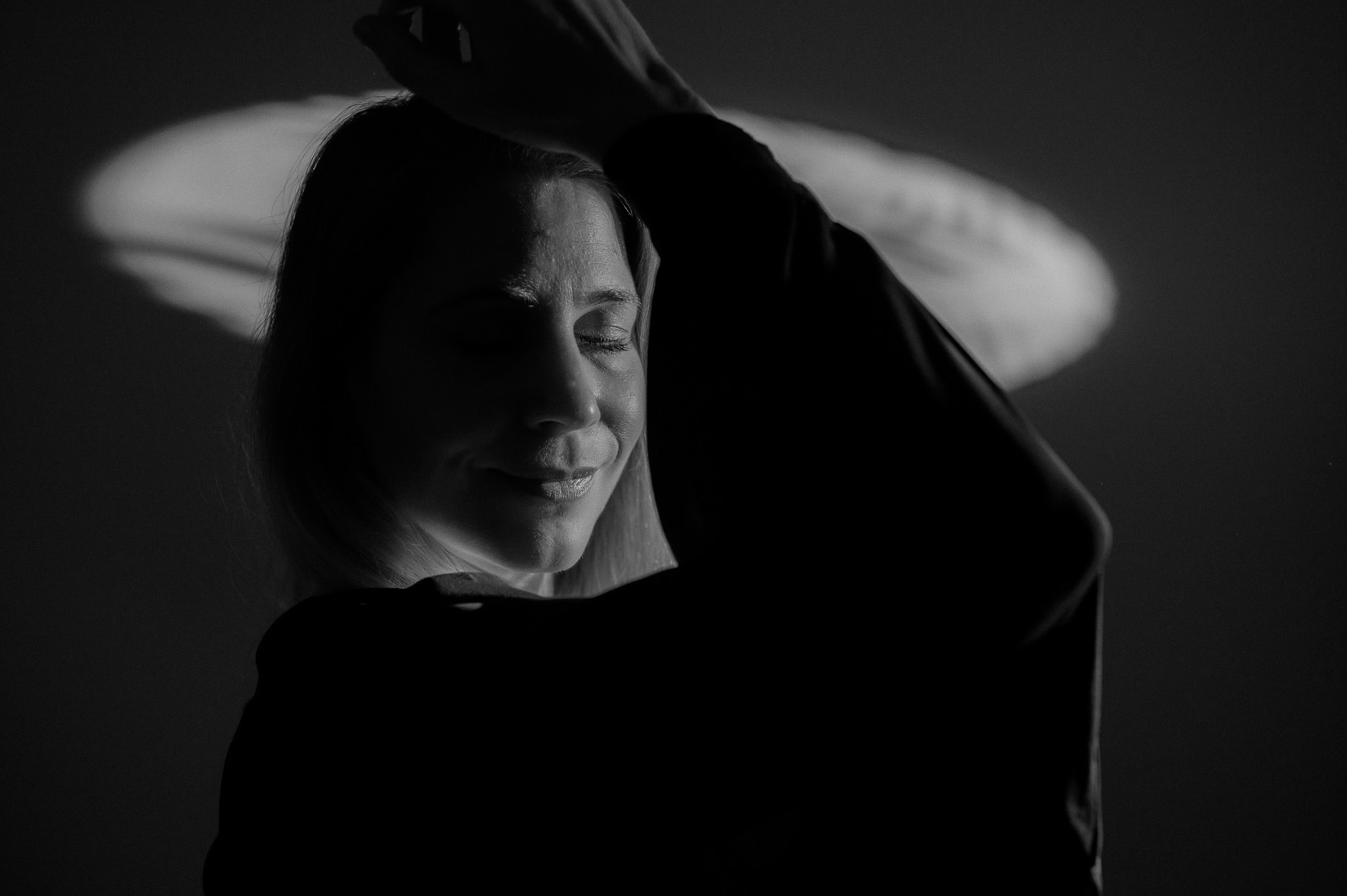 Dieses künstlerische Schwarz Weiß Porträt zeigt eine Frau mit geschlossenen Augen und einem sanften Lächeln hervorgehoben durch kreative Lichtgestaltung Perfekt für kreative Fotografie und Kunstpräsentationen