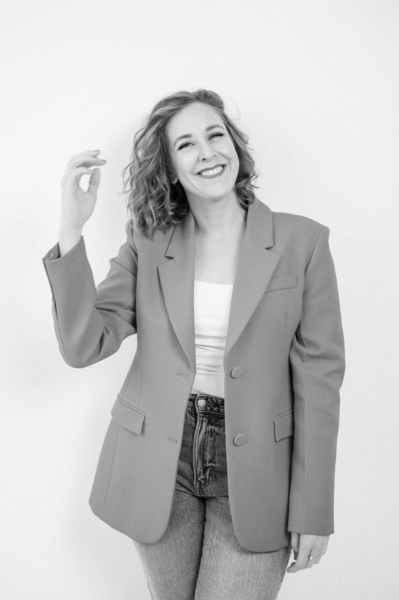 Dieses professionelle Businessfoto zeigt eine junge Frau in einem grauen Blazer die freundlich in die Kamera lächelt Es eignet sich ideal für Karriere und Unternehmensfotografie um Vertrauen und Kompetenz zu vermitteln Das Bild ist in Schwarz Weiß gehalten was den Fokus auf die Persönlichkeit und Professionalität legt Perfekt für Business Profile LinkedIn Firmenwebseiten und Personal Branding