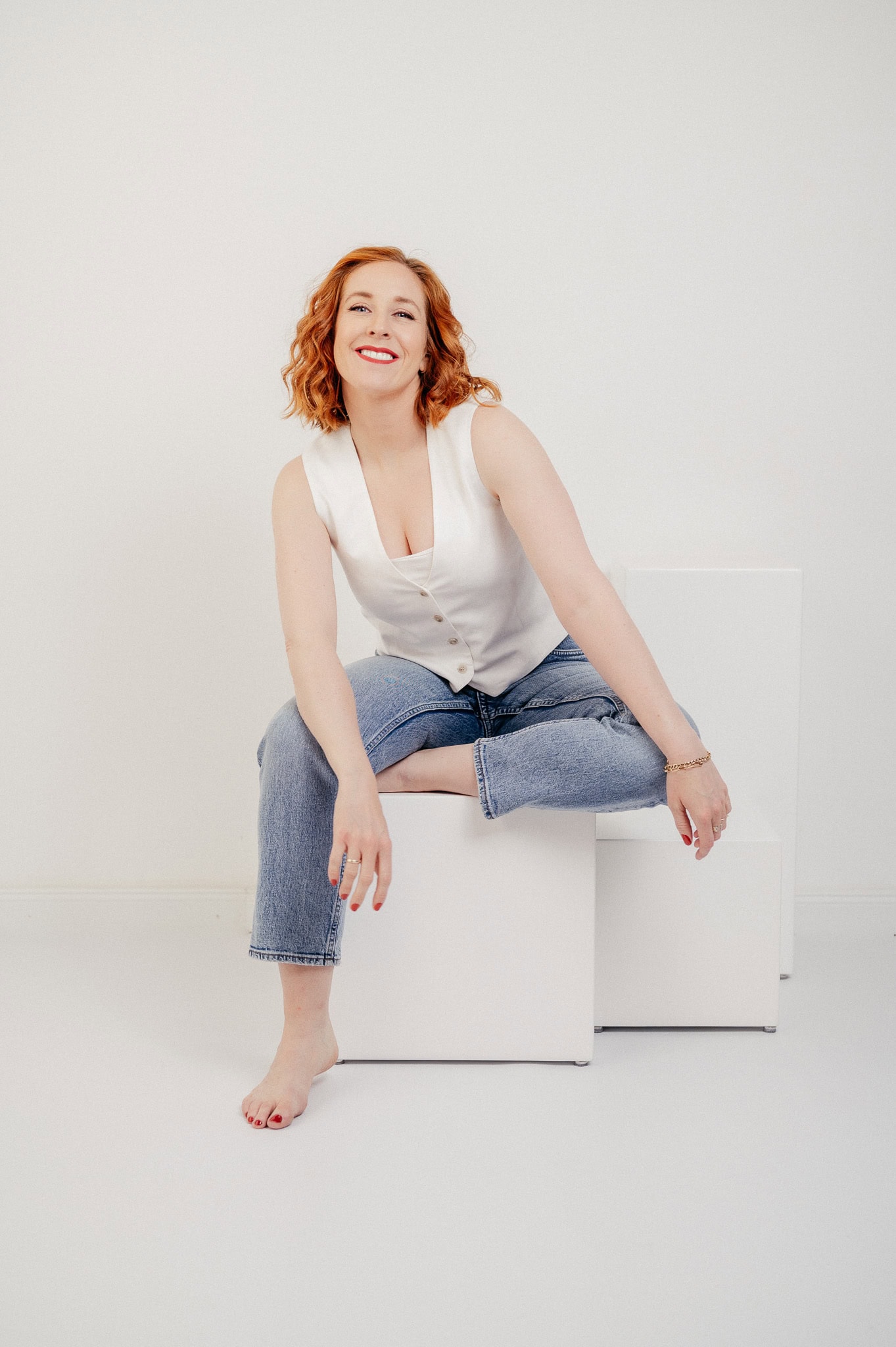 Dieses Bild zeigt eine junge Frau mit roten Locken die auf weißen Kisten in einem hellen Studio sitzt Sie wirkt entspannt und freundlich ideal für Business oder Lifestyle Fotografie