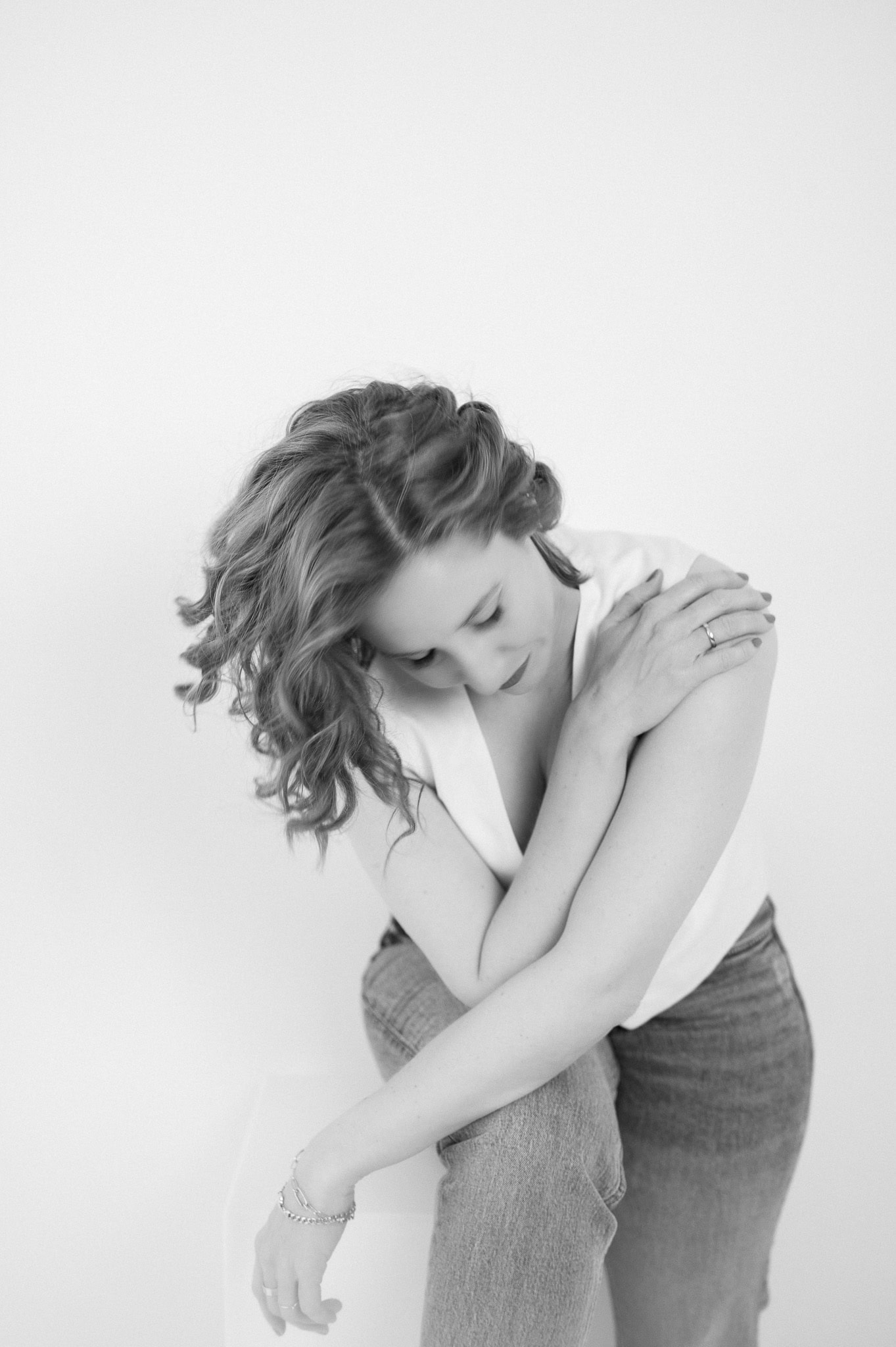 Das Bild zeigt eine junge Frau in Businesskleidung die in einem professionellen Fotoshooting für Unternehmens und Personal Branding fotografiert wird Es ist ein Schwarz Weiß Porträt das die Persönlichkeit und Professionalität der Person betont ideal für Karriere und Businessfotografie