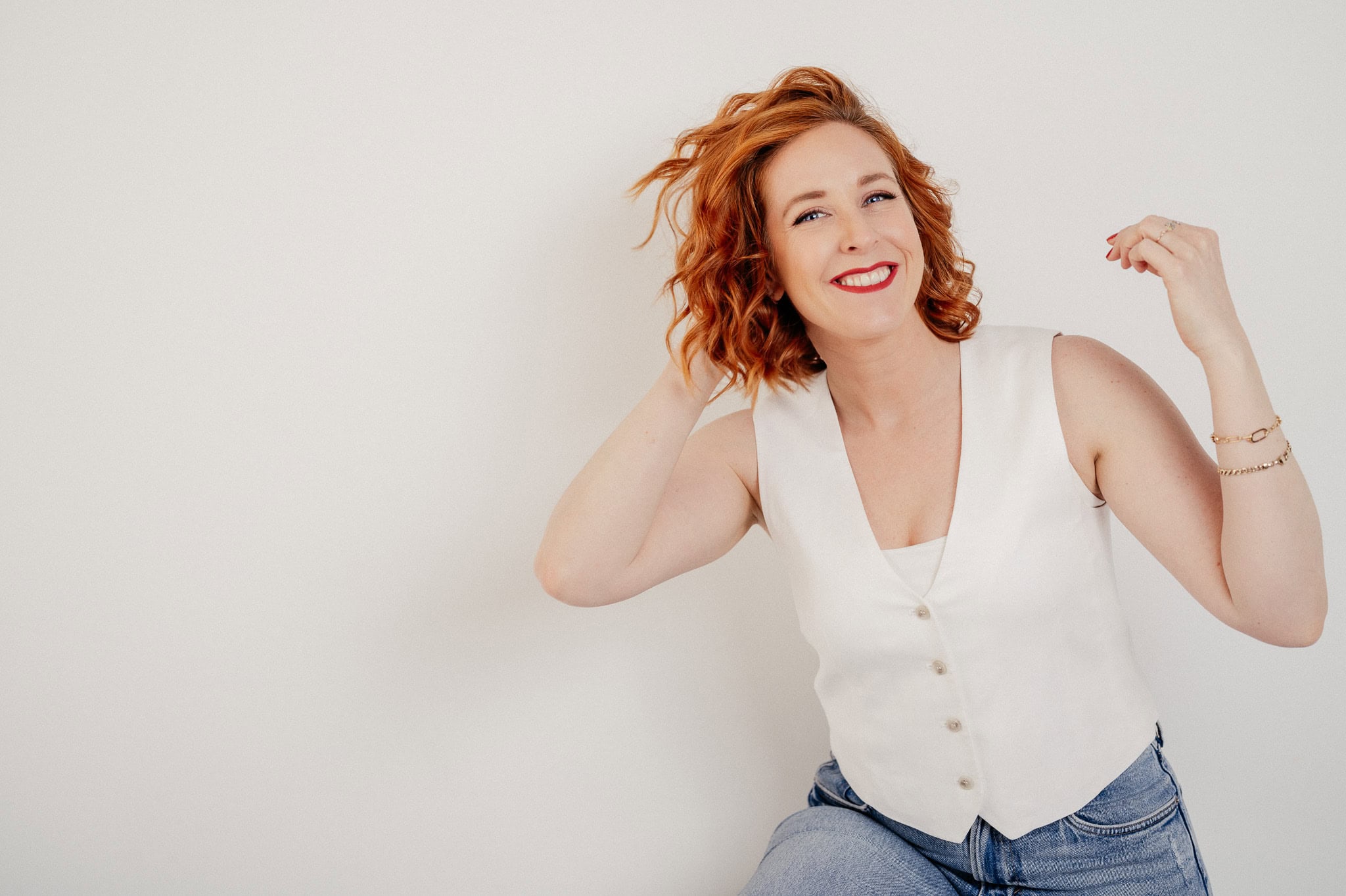 Das Bild zeigt eine junge Frau mit roten Locken die selbstbewusst und freundlich in einem weißen Top und Jeans posiert Es eignet sich perfekt für Businessfotografie Personal Branding und Karrierebilder um Professionalität und Persönlichkeit zu vermitteln Die helle schlichte Kulisse lenkt den Fokus auf die Person und ihre Ausstrahlung