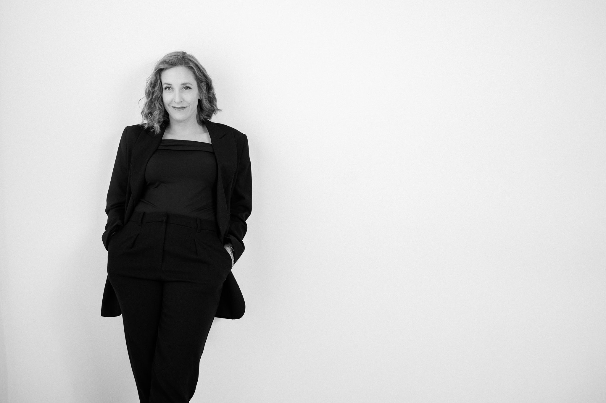 Dieses professionelle Businessfoto zeigt eine Frau in formeller Kleidung vor einem schlichten weißen Hintergrund perfekt für Karriere und Unternehmenspräsentationen Es unterstreicht Kompetenz Selbstsicherheit und Professionalität ideal für Business und Personal Branding