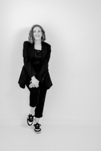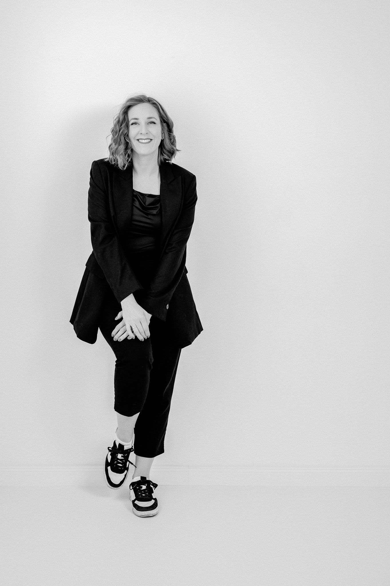 Das Bild zeigt eine junge Frau in Businesskleidung die selbstbewusst und freundlich in die Kamera lächelt Es ist ideal für professionelle Business und Personal Branding Fotos die Kompetenz und Persönlichkeit vermitteln Die schlichte weiße Wand im Hintergrund lenkt den Fokus auf die Person und eignet sich perfekt für Unternehmensprofile Karrierefotos oder Marketingmaterialien