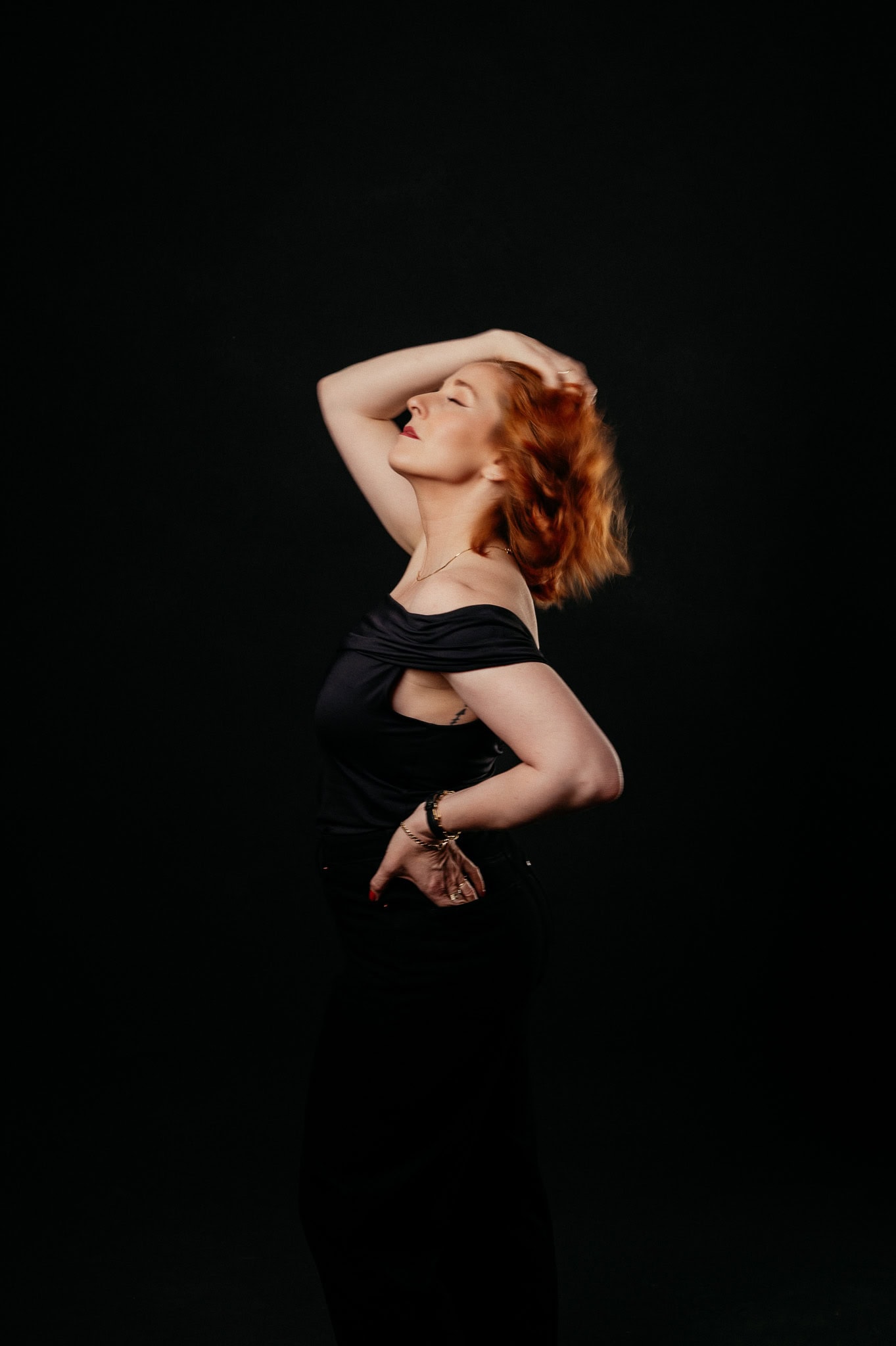 Das Bild zeigt eine lachende Frau mit roten Haaren die vor einem schwarzen Hintergrund steht Es vermittelt Freude Selbstbewusstsein und künstlerische Fotografie im Bereich Portraits