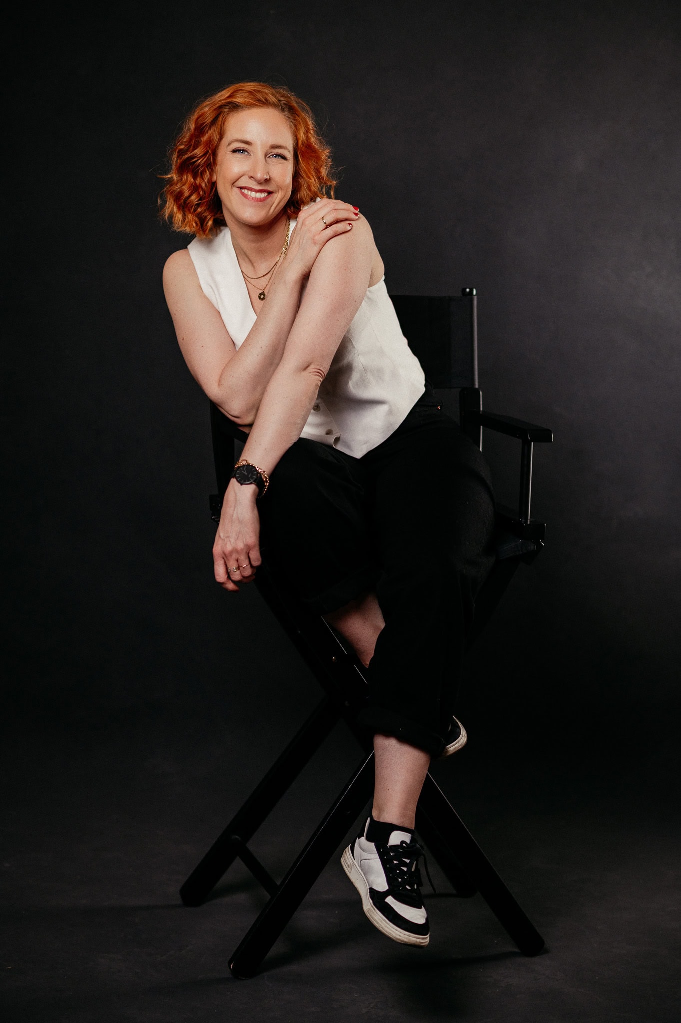 Das Bild zeigt eine junge Frau mit roten lockigen Haaren die in einem professionellen Umfeld für Businessfotografie posiert Sie trägt eine weiße Bluse schwarze Hosen und Sneakers sitzt entspannt auf einem Stuhl vor dunklem Hintergrund Perfekt für Karriere und Unternehmensfotos die Kompetenz und Persönlichkeit vermitteln