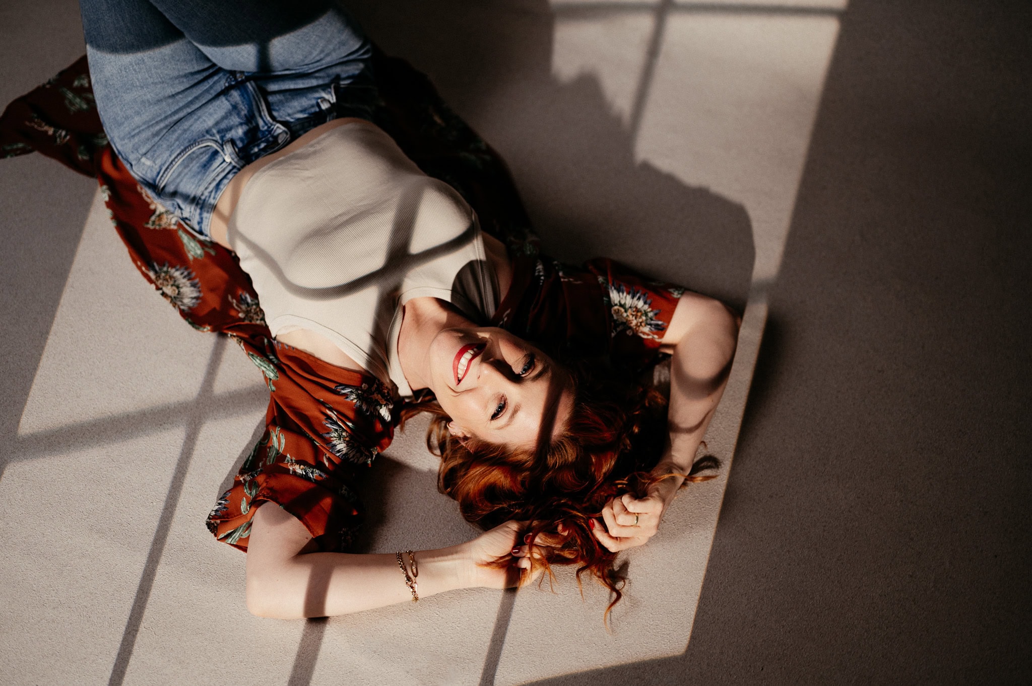 Das Bild zeigt eine junge Frau mit roten Haaren die auf dem Boden liegt umgeben von Sonnenlicht das durch Fenster fällt Es vermittelt eine moderne kreative Atmosphäre für Business und Personal Branding Fotos