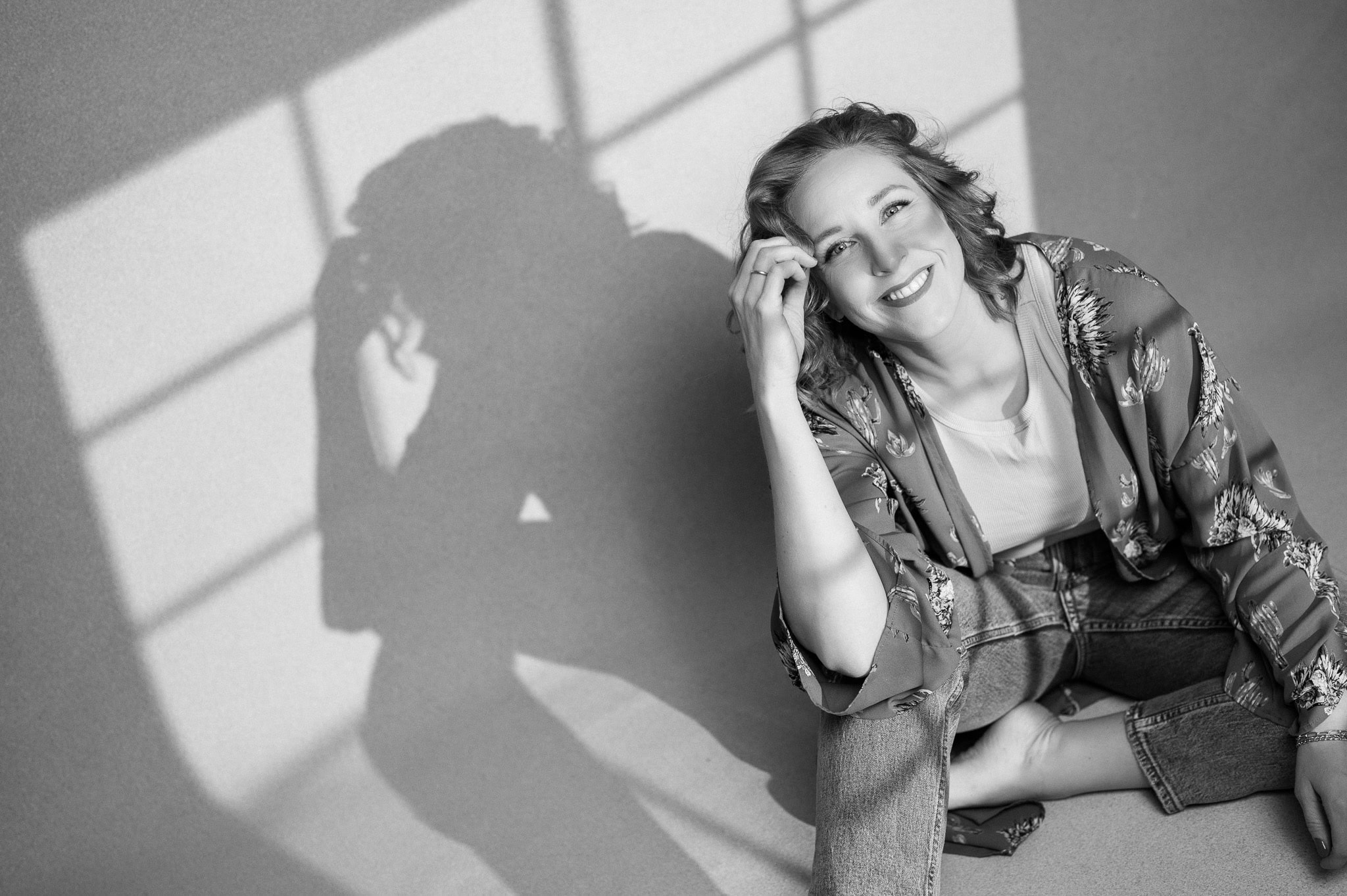 Das Bild zeigt eine junge Frau in Businesskleidung die entspannt und freundlich in einem professionellen Umfeld sitzt Das natürliche Lächeln und die lockere Haltung vermitteln Selbstvertrauen und Offenheit ideal für Personal Branding und Karrierefotos Das Licht fällt durch das Fenster und erzeugt interessante Schatten die das Bild lebendig und ansprechend machen Perfekt geeignet für Unternehmens und Businessfotografie um Kompetenz und Persönlichkeit zu präsentieren