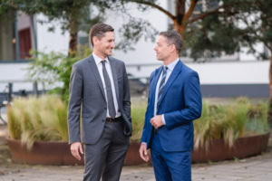 Das Bild zeigt zwei Männer in formeller Kleidung die sich im Freien unterhalten Es vermittelt Professionalität Networking und Erfolg im Business Perfekt für Unternehmensfotografie Personal Branding und Karrierefotos Die Szenerie ist modern und ansprechend gestaltet ideal für Business und Karrierepräsentationen