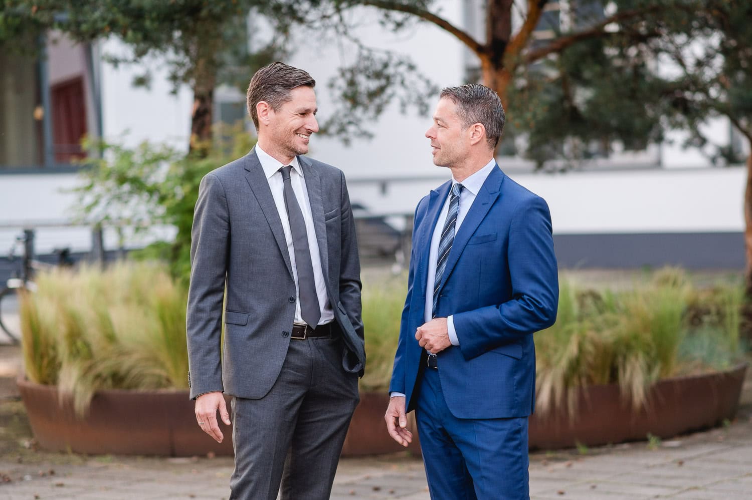 Das Bild zeigt zwei Geschäftsmänner in Anzügen die sich vor einem modernen Bürogebäude im Freien unterhalten Es vermittelt Professionalität Zusammenarbeit und Business Networking im beruflichen Umfeld