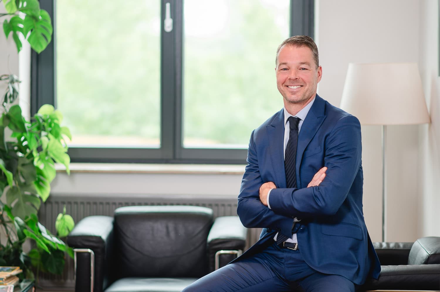 Das Bild zeigt einen professionell gekleideten Mann in einem modernen Büro der selbstbewusst und freundlich in die Kamera lächelt Es eignet sich für Business und Personal Branding um Kompetenz und Vertrauen auszustrahlen Das natürliche Licht und die moderne Umgebung unterstreichen die professionelle Atmosphäre Perfekt für Unternehmenswebseiten LinkedIn Profile und Karrierefotos