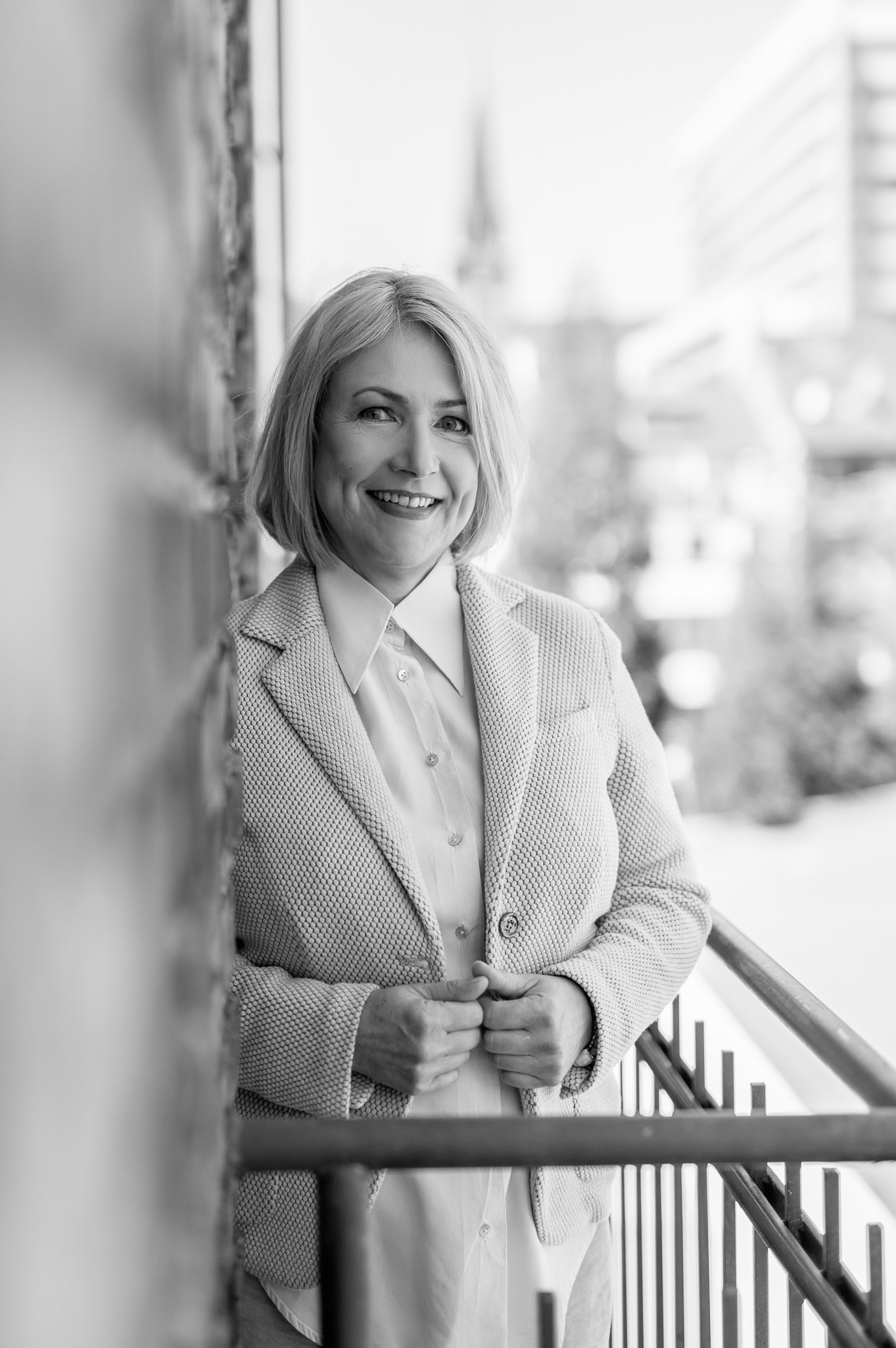Dieses Bild zeigt eine selbstbewusste Frau in Business Kleidung die auf einer Stadtterrasse steht Es eignet sich hervorragend für Unternehmens und Karrierefotos um Professionalität und Persönlichkeit zu vermitteln Die urbane Umgebung unterstreicht den modernen dynamischen Charakter des Business Images Perfekt für Personal Branding Unternehmensprofile oder Karriereportale