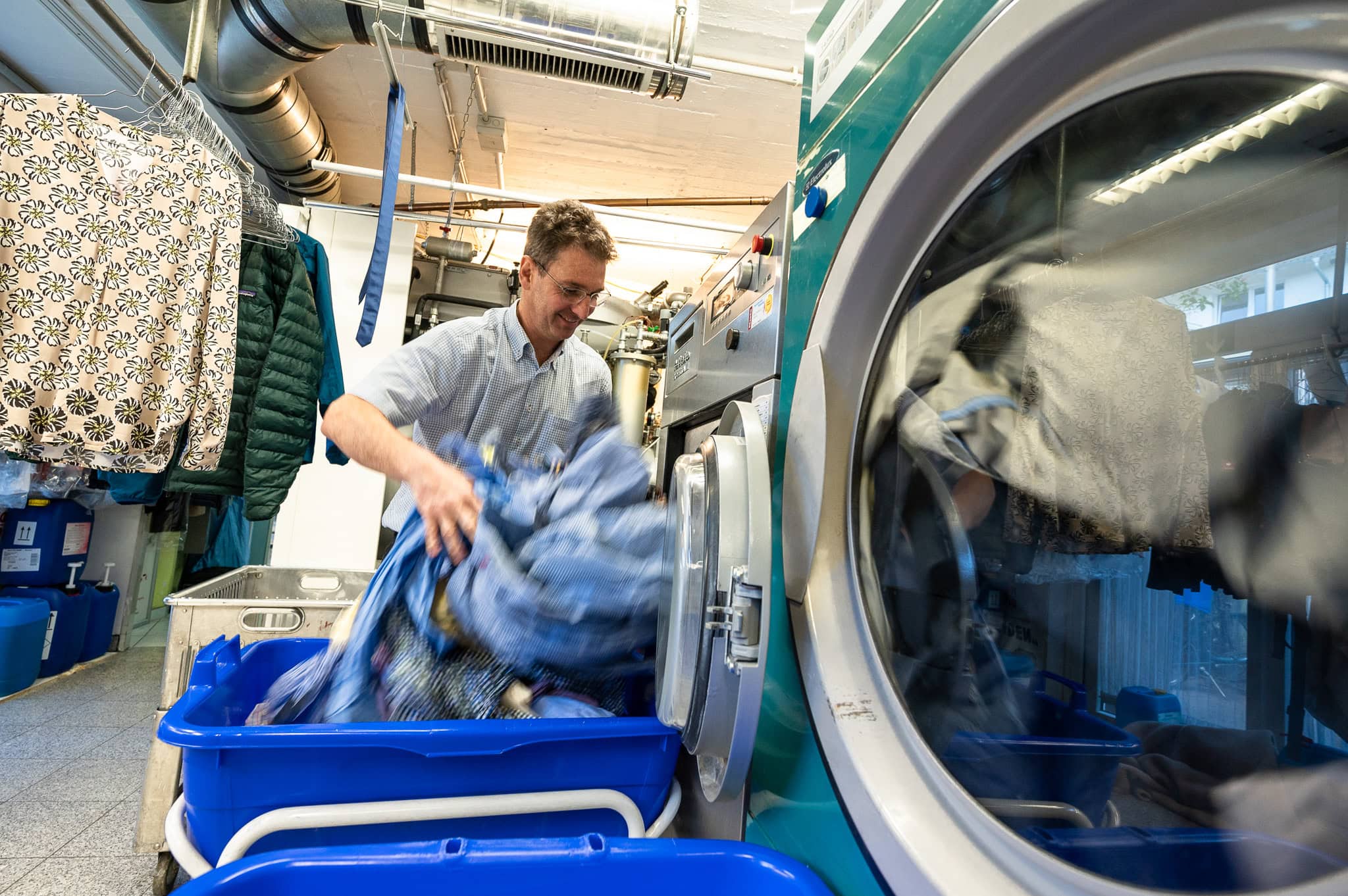 Das Bild zeigt einen Mann der in einer Wäscherei Kleidung sortiert Es handelt sich um eine professionelle Textilpflegeeinrichtung die sich auf Business und Unternehmenswäsche spezialisiert hat Die Umgebung ist funktional und sauber mit Waschmaschinen und Wäschekörben sichtbar Dieses Bild eignet sich für Businessfotografie Personal Branding und Unternehmenspräsentationen im Bereich Wäschereidienstleistungen